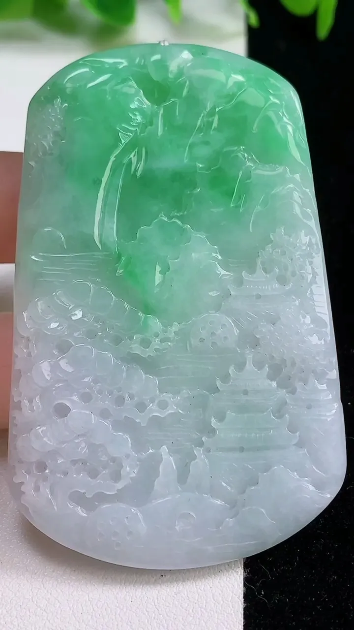 天然A货翡翠山水牌吊坠,尺寸68.8-44.4-5,重量:37.98g 10月15日