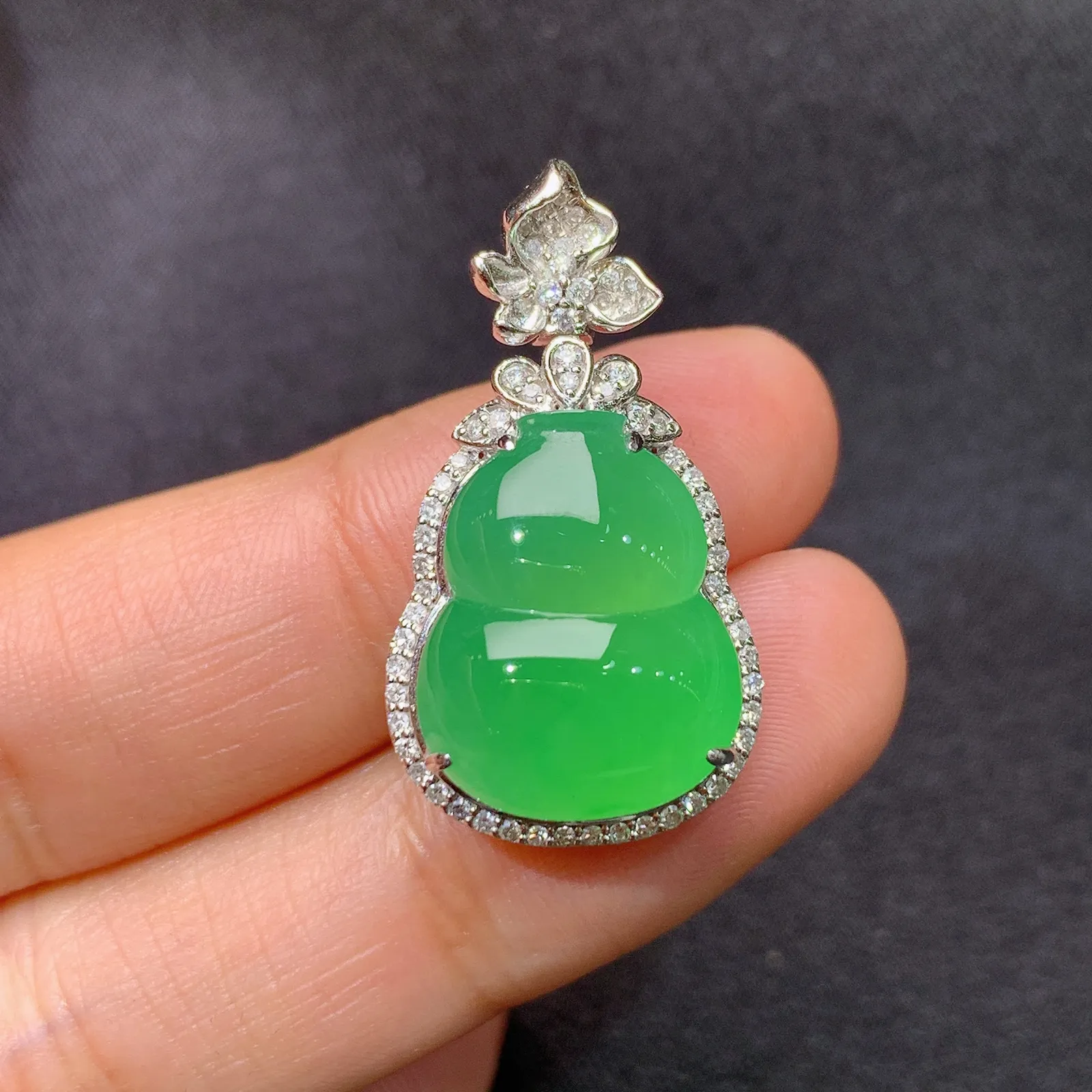 翠绿葫芦吊坠,18k金镶嵌,冰润色阳,玉质细腻,种水足,Lp 尺寸28.7*15.8*10.9