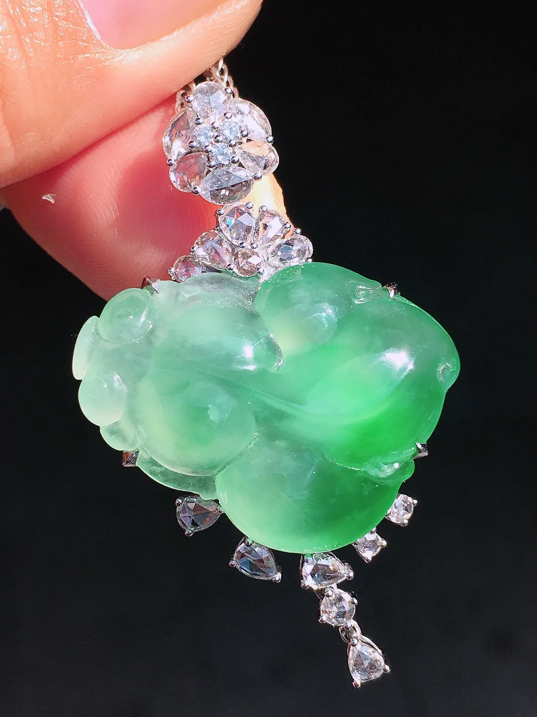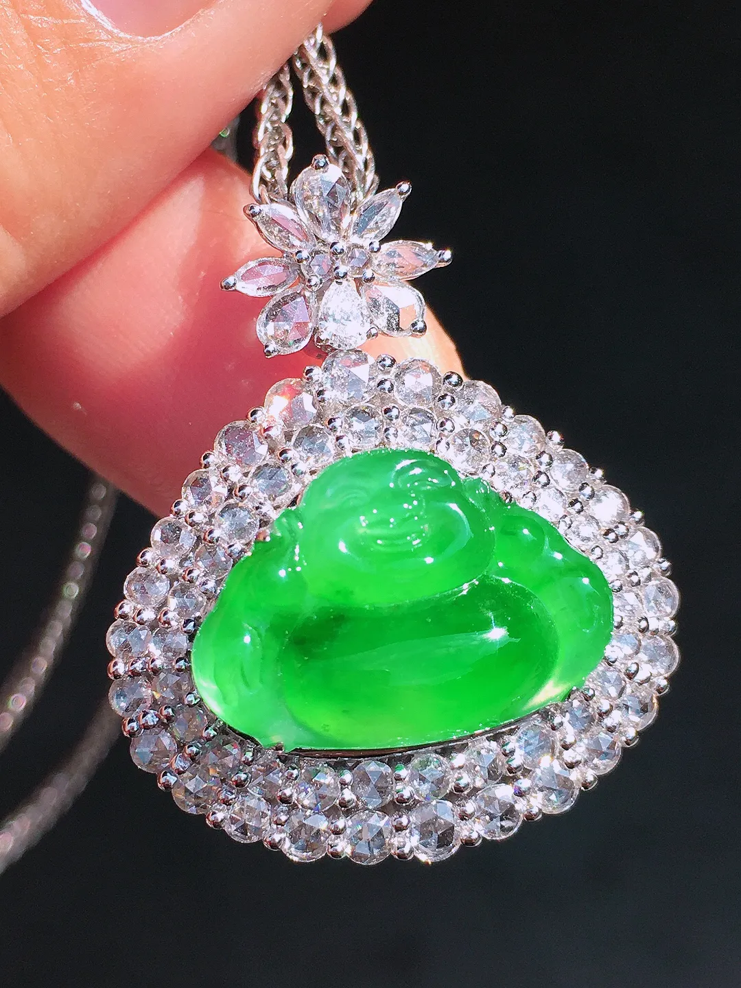 阳绿佛公吊坠,色泽均匀艳丽,玉质细腻,荧光感超 强,饱满圆润,尽显优雅气质,18k 金豪华镶嵌