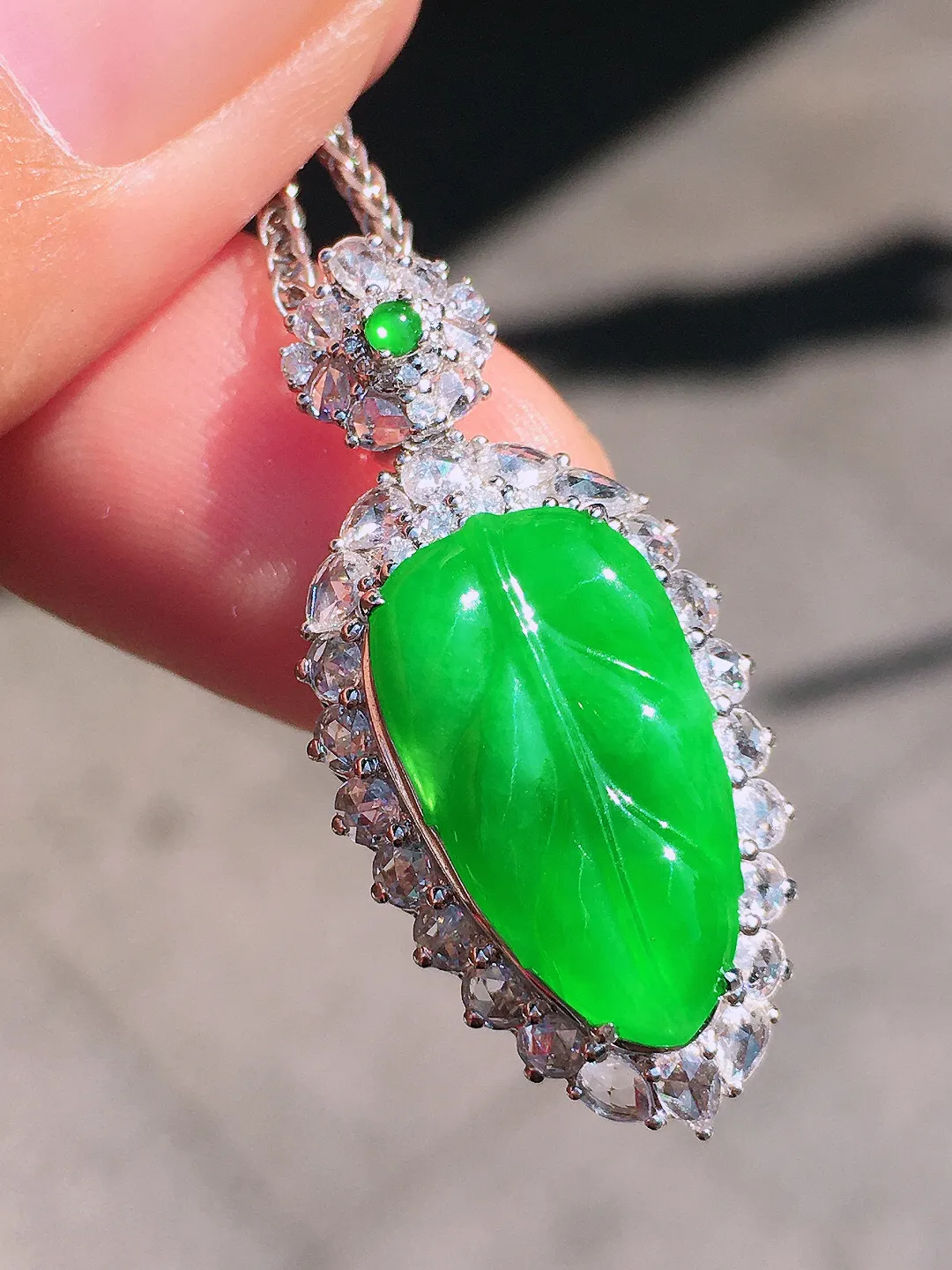 阳绿玉叶吊坠,色泽均匀艳丽,玉质细腻,荧光感超 强,饱满圆润,尽显优雅气质,18k 金豪华镶嵌