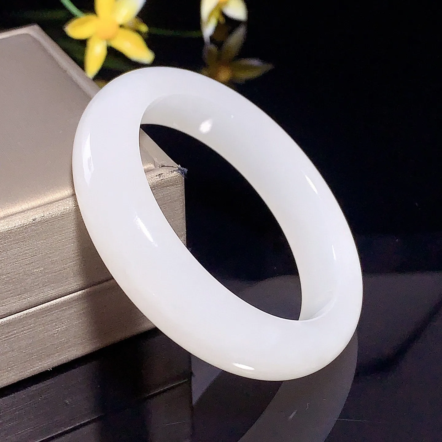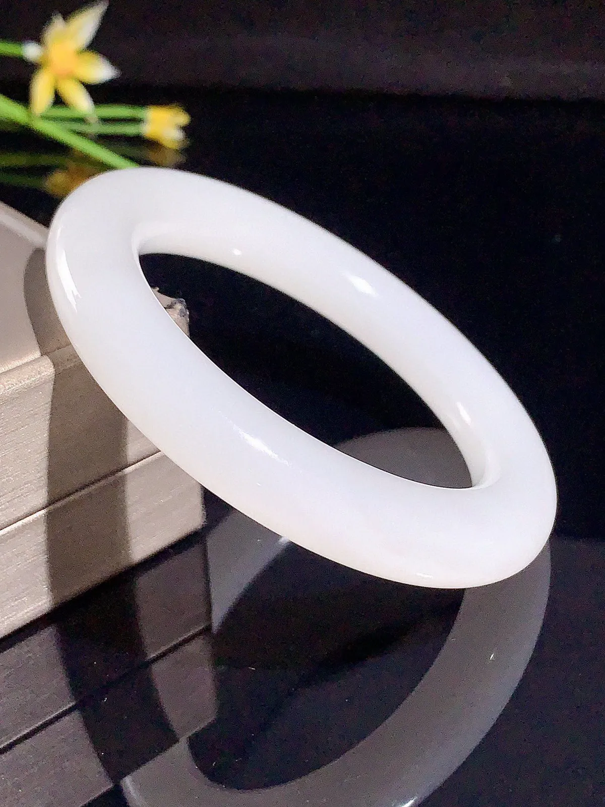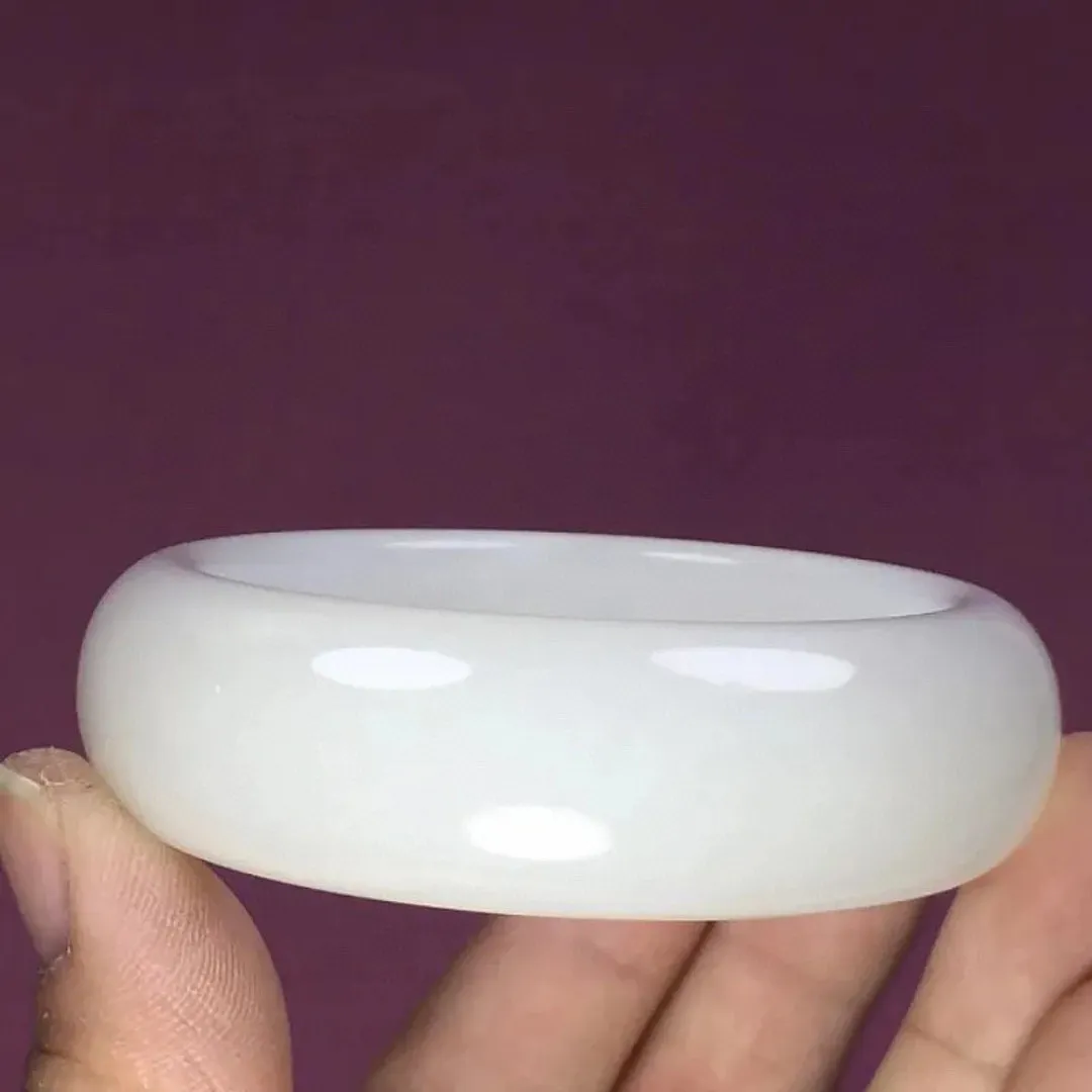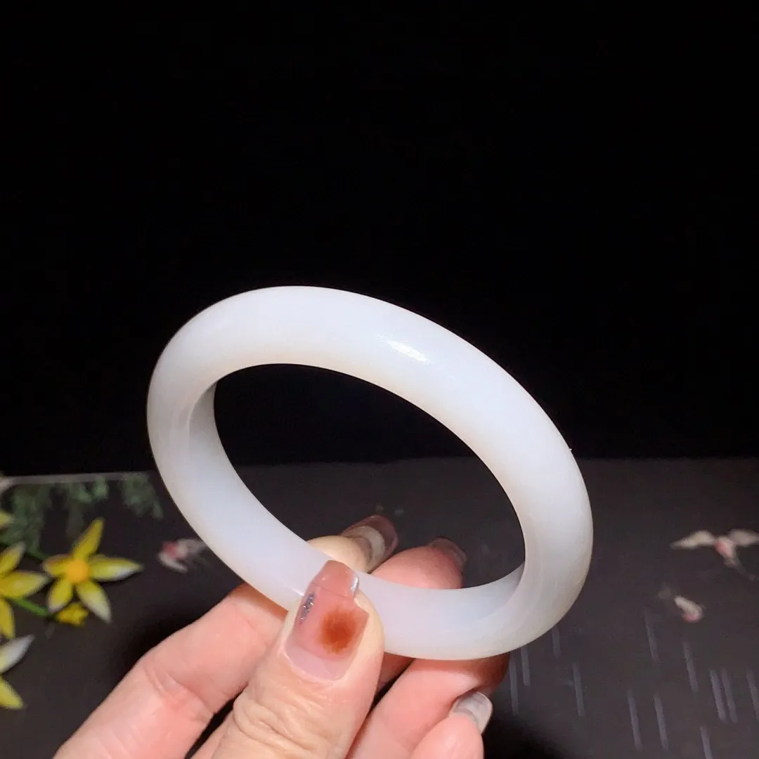 冰白色,圈口57宽13新疆和田玉57圈口羊脂白玉肥圆条手镯,略带一个黑点,料子细度好,品质好