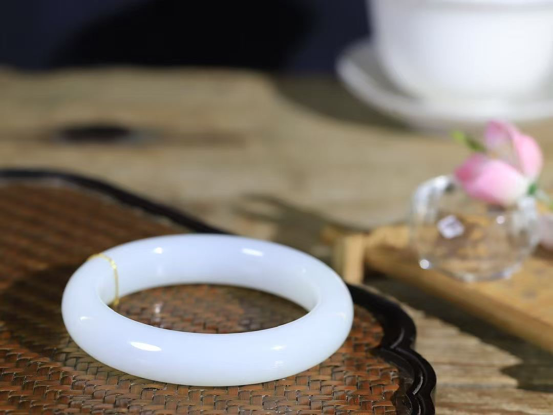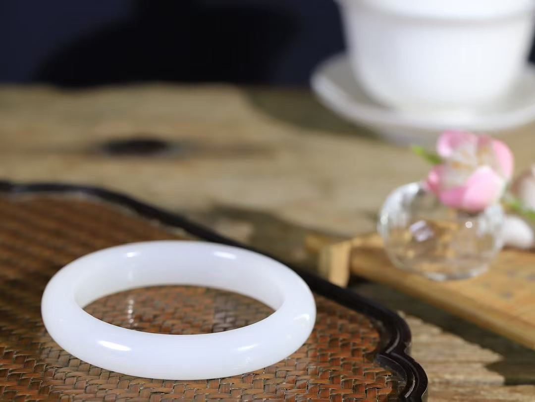 【荷韵.手镯】 精品和田玉糖白玉手镯 玉质温润细腻 手感舒适,高华雅逸,线条流畅 素雅高贵。佩戴于
