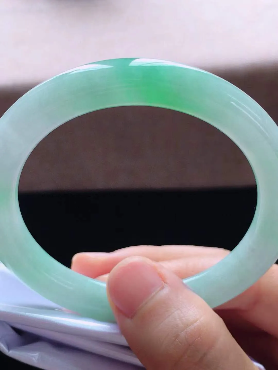 【翡翠名称】老种飘绿花53.3圈口圆条翡翠手镯 【翡翠尺寸】53.3*8.2*8.5mm适合52.5