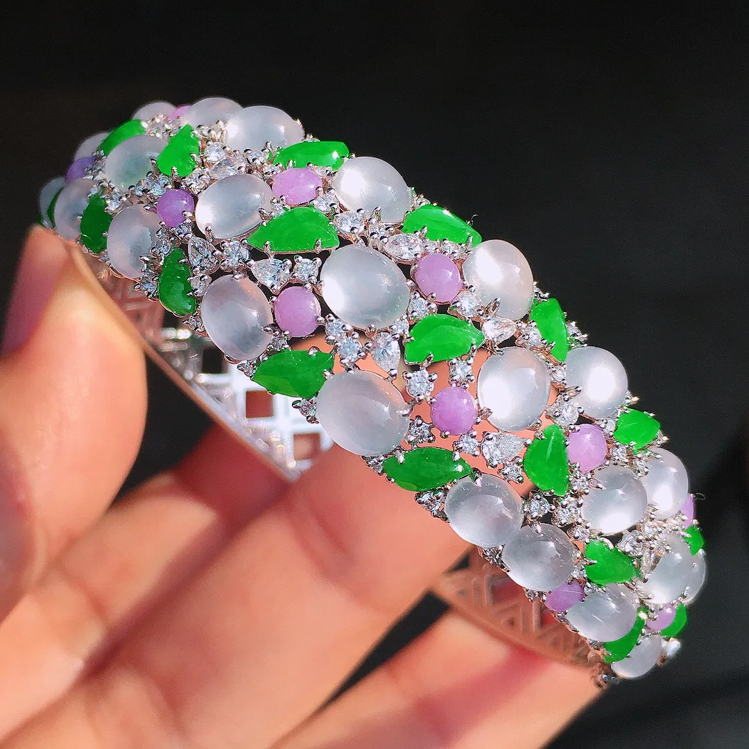 三彩蛋面手镯,色泽均匀艳丽,玉质细腻,荧光感超 强,饱满圆润,尽显优雅气质,18k 金豪华镶嵌