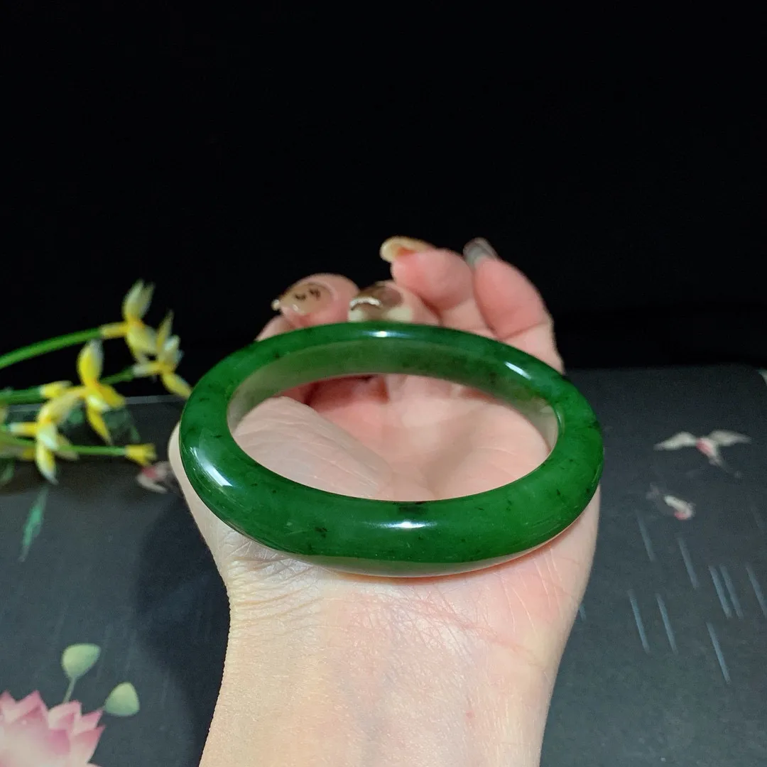 和田玉59.9圈口菠菜绿碧玉手镯!圈口59.9宽12.7重46.9克,玉质细腻油润 底色纯净 无裂无