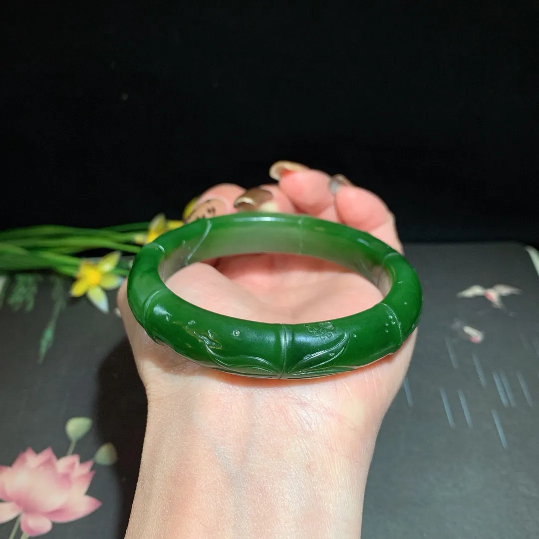 和田玉59圈口菠菜绿雕花碧玉手镯!玉质细腻油润 底色纯净 无裂无棉 脂粉好,品质高