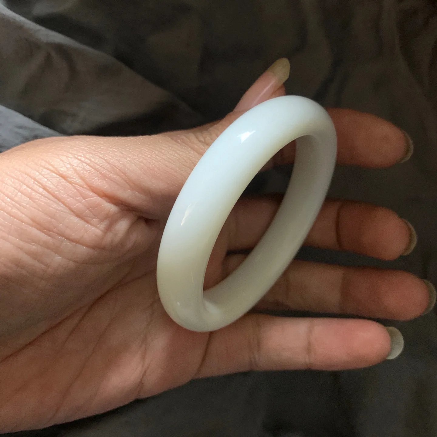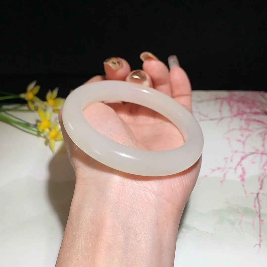 55圈口 新疆和田玉羊脂白籽料手镯 55圈口条宽 16厚10重82克。玉质细腻油润。手推出油。佩戴高