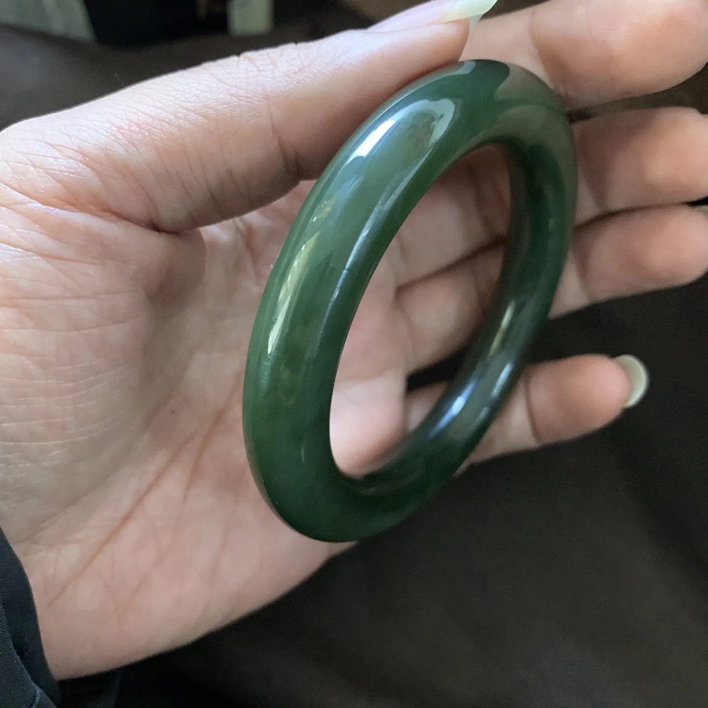 和田玉56.1圈口菠菜绿手镯,镯型古朴典雅。在诗情画意的雨巷相遇,你是我腕间的一抹风情,有你眸有深情