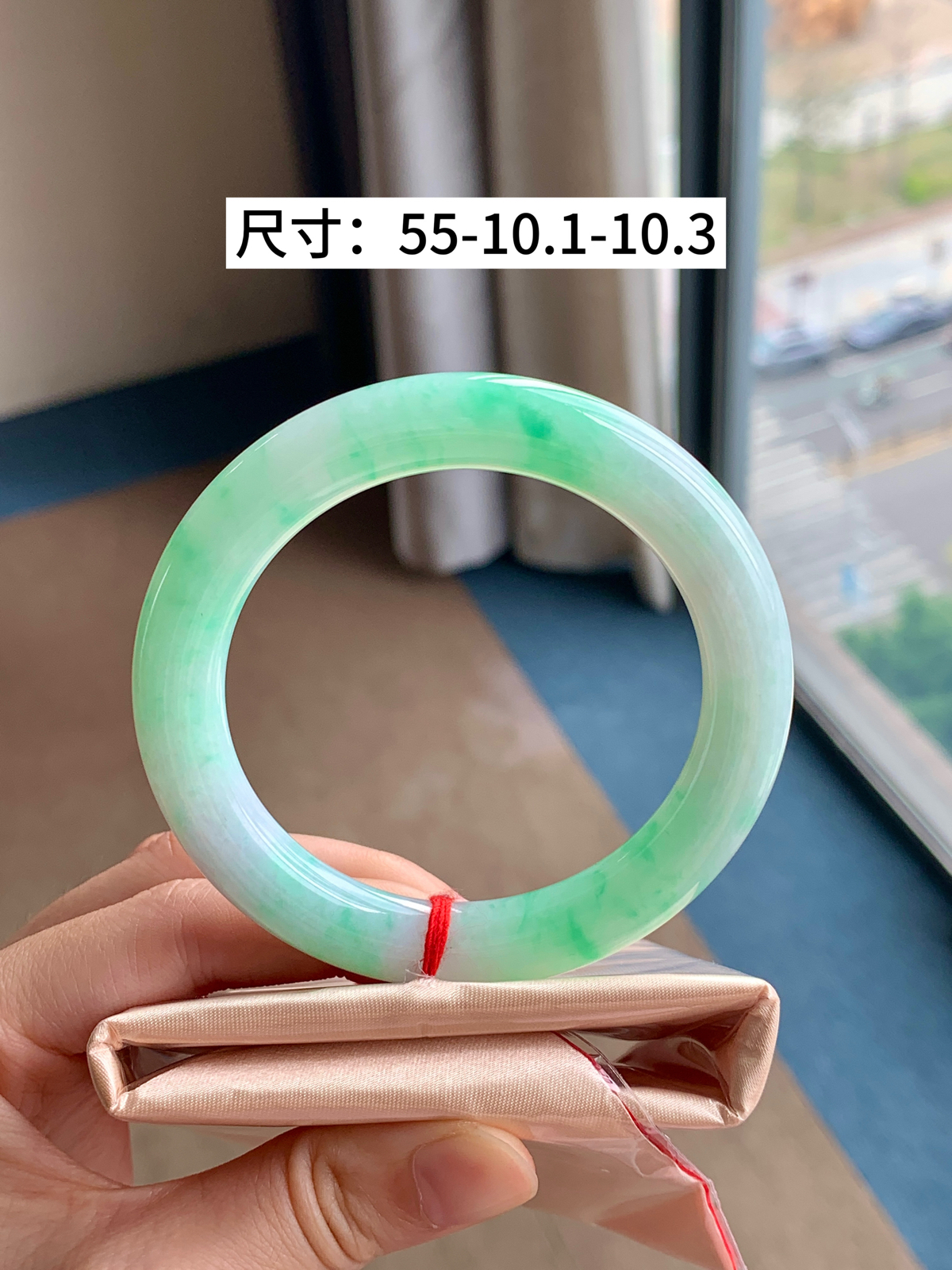 自然光拍摄天然翡翠A货淡绿好种水56.7mm正圈手镯53.62 克
