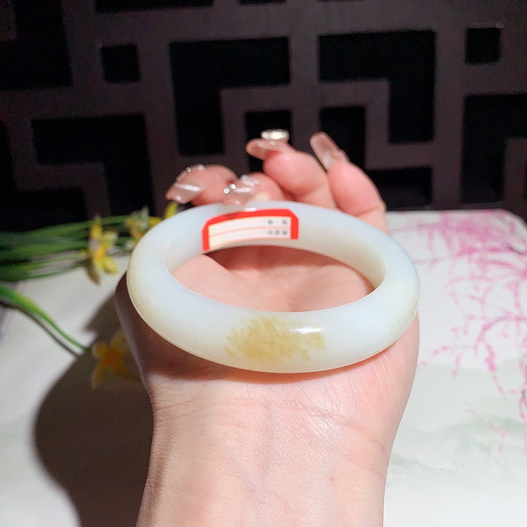和田玉58圈且末糖手镯玉质细腻油润 底色纯净 无裂无棉 脂粉好,品质高。