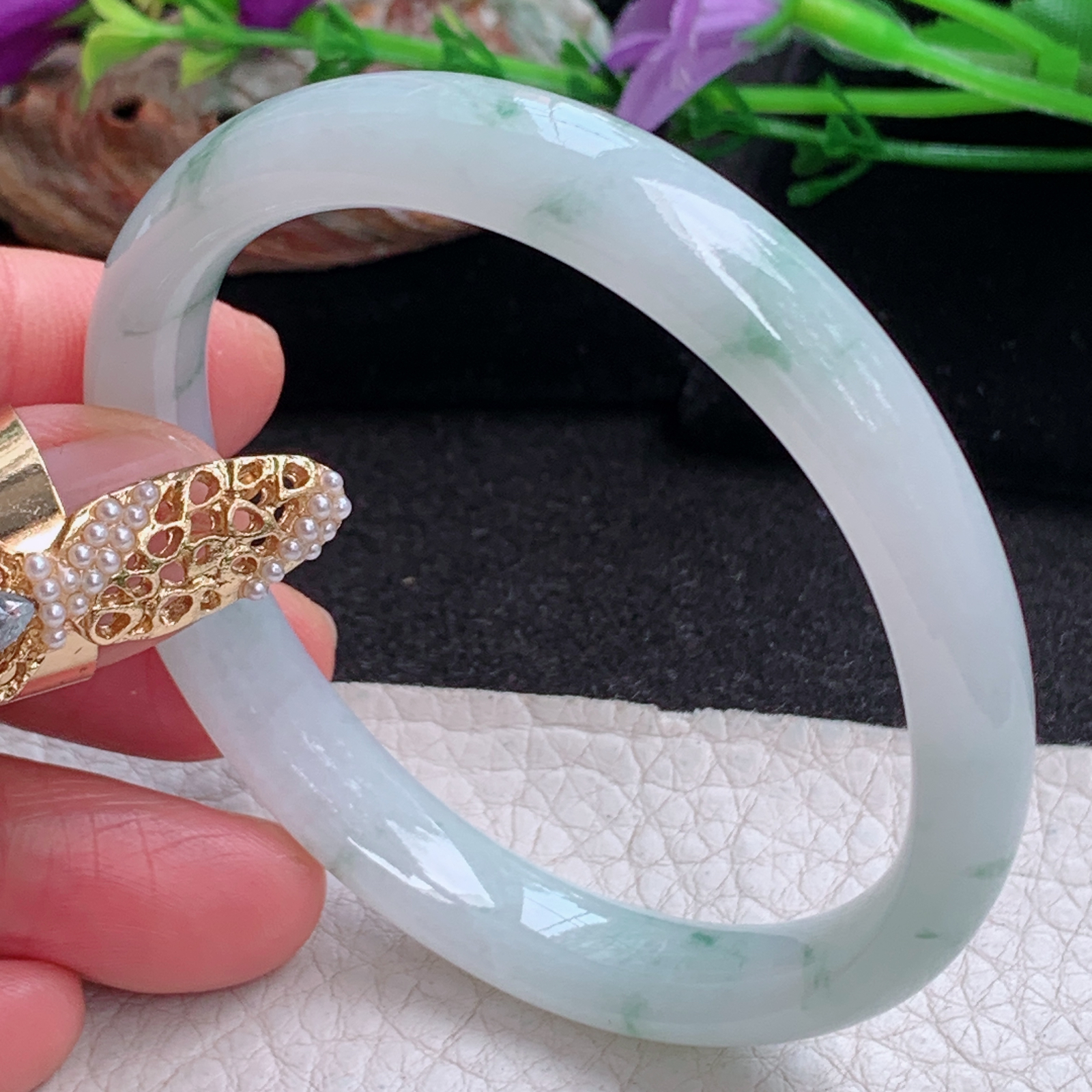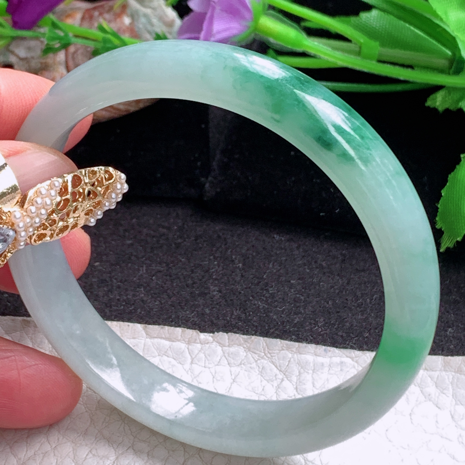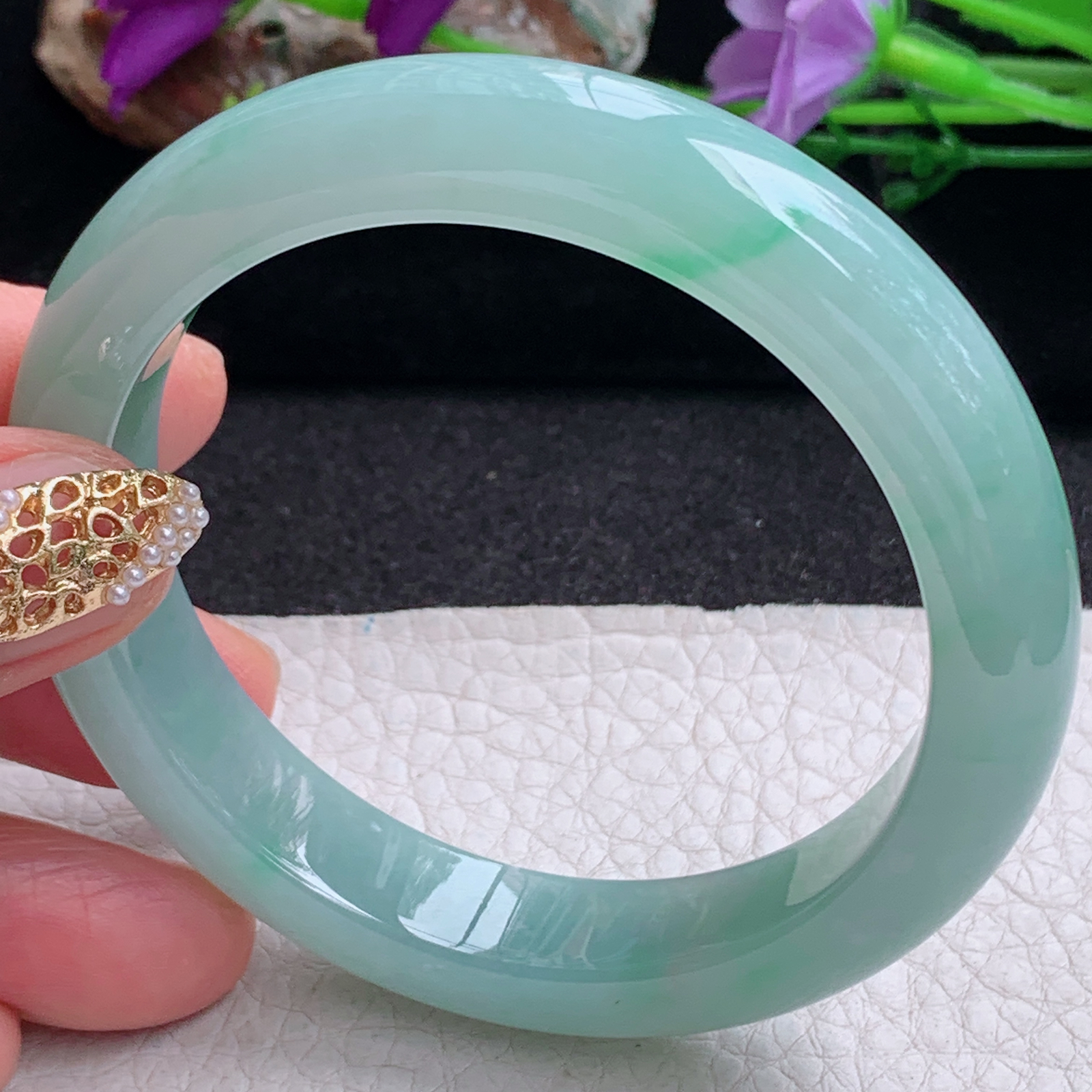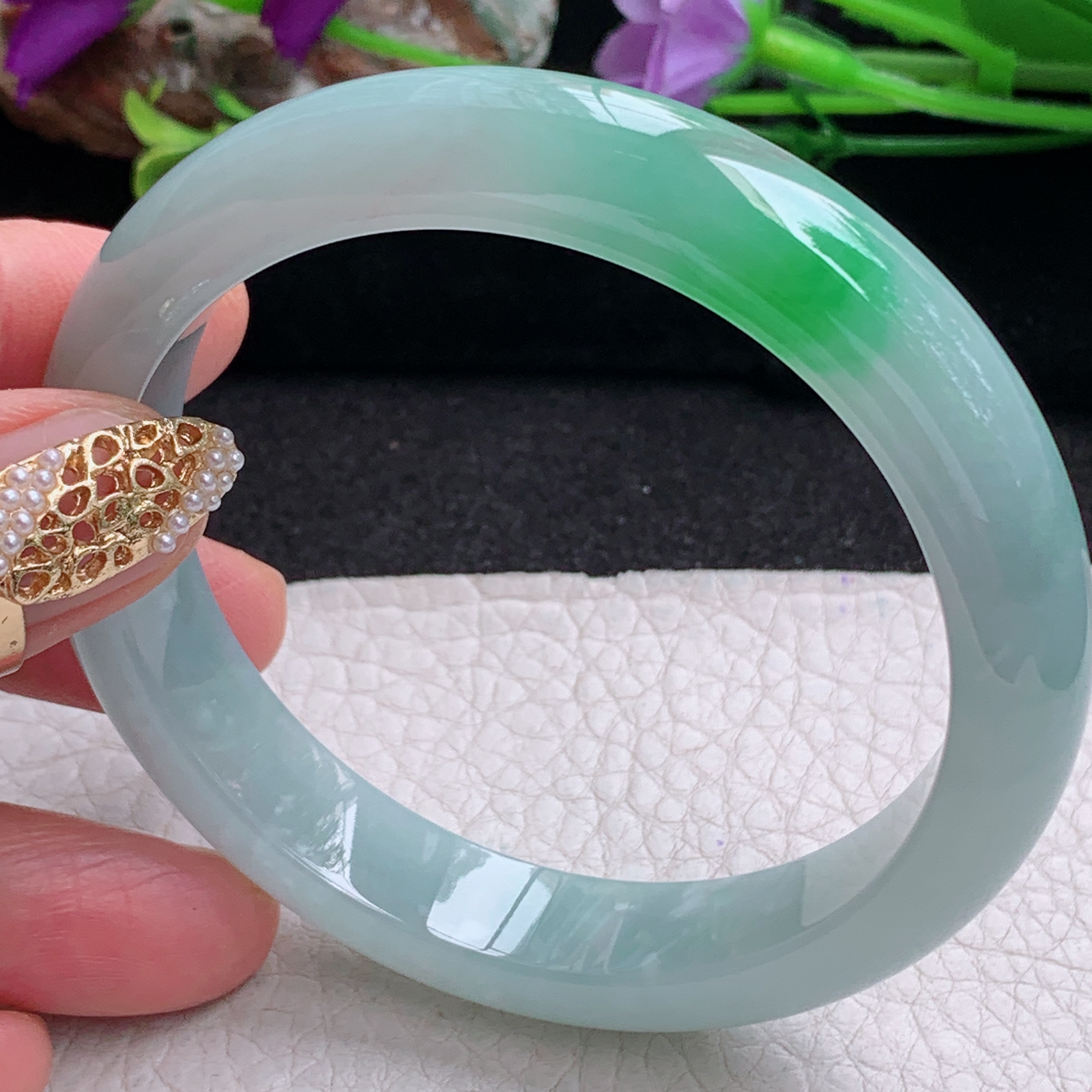 A货天然翡翠冰糯种飘花手镯59圈重量52.54 4月21日