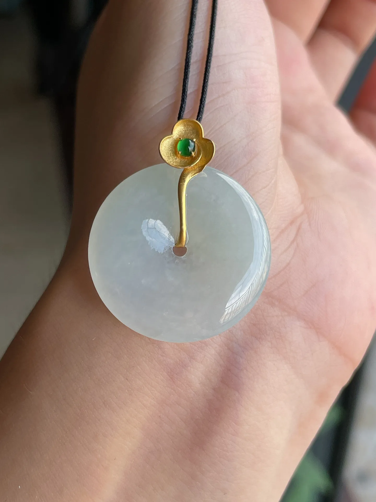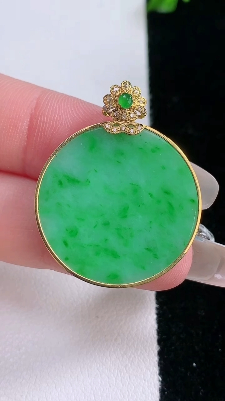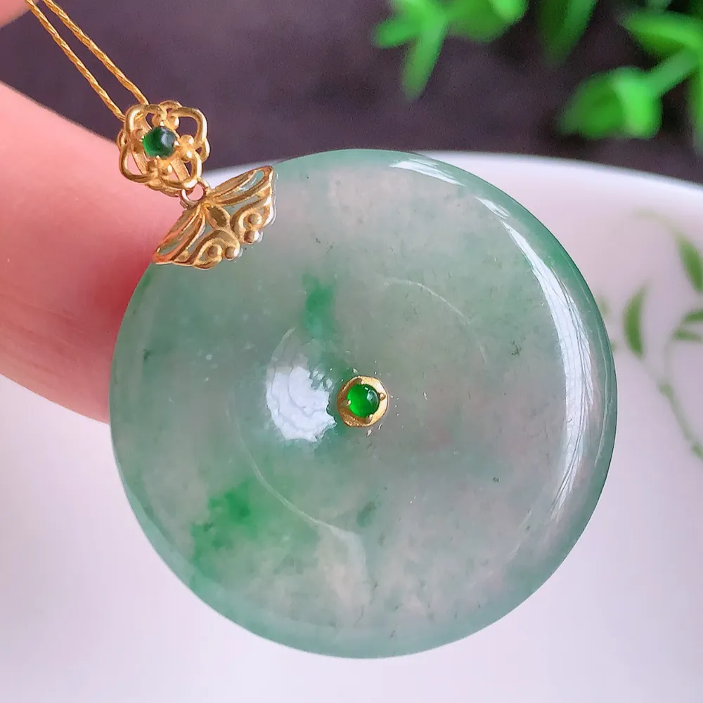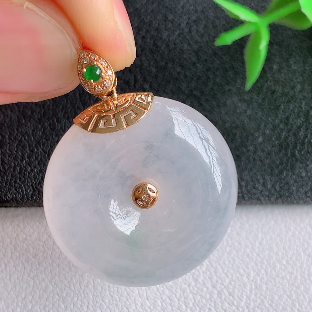 缅甸天然翡翠A货,18k金镶嵌冰飘绿平安扣吊坠,尺寸:整体31/23.6/4.3mm,祼石23.6/4.3mm,重量:5.74g