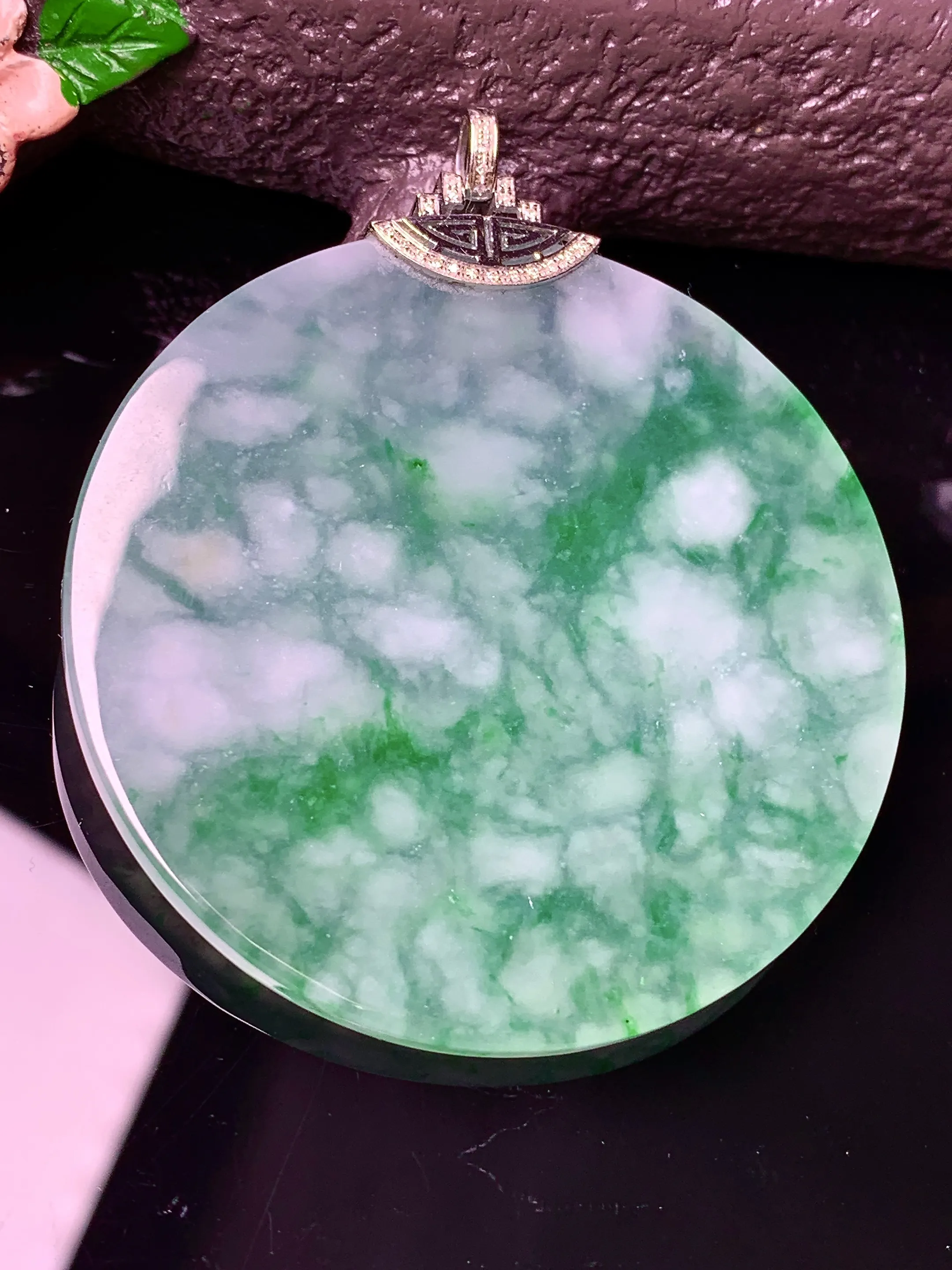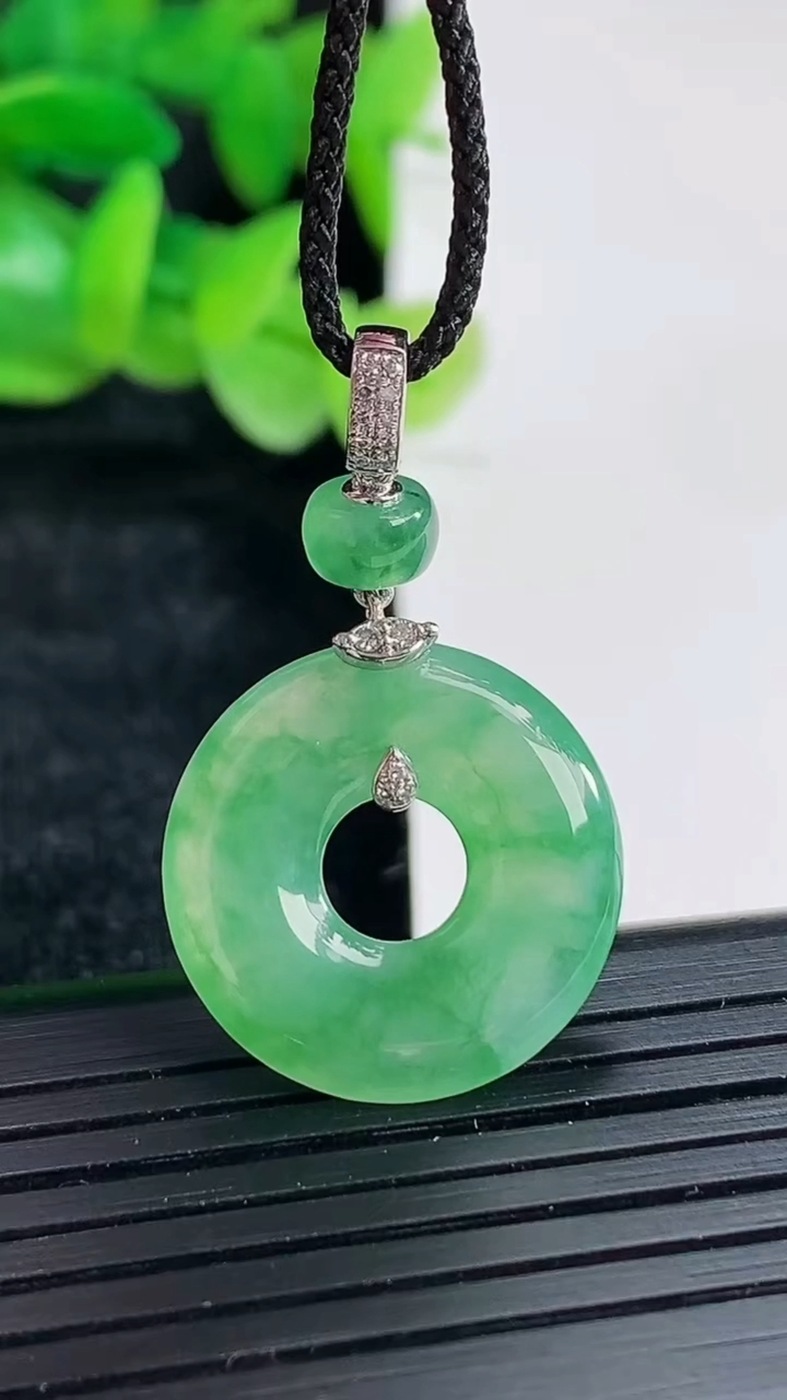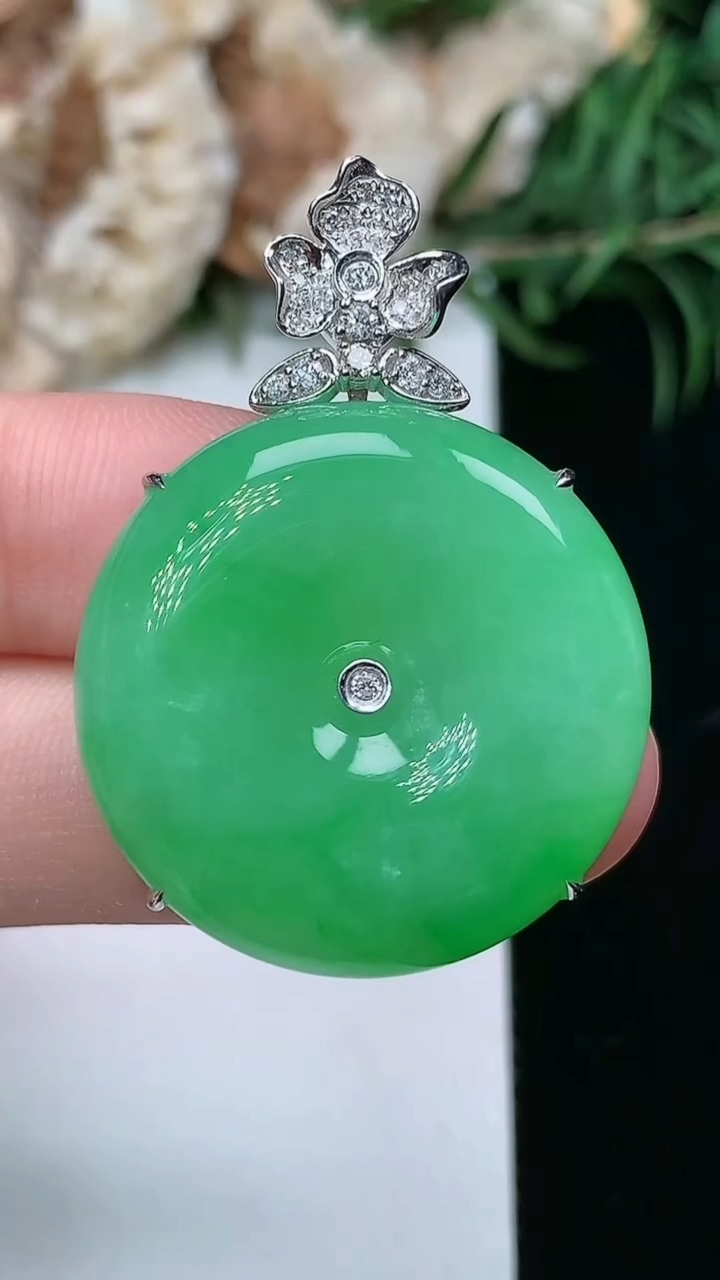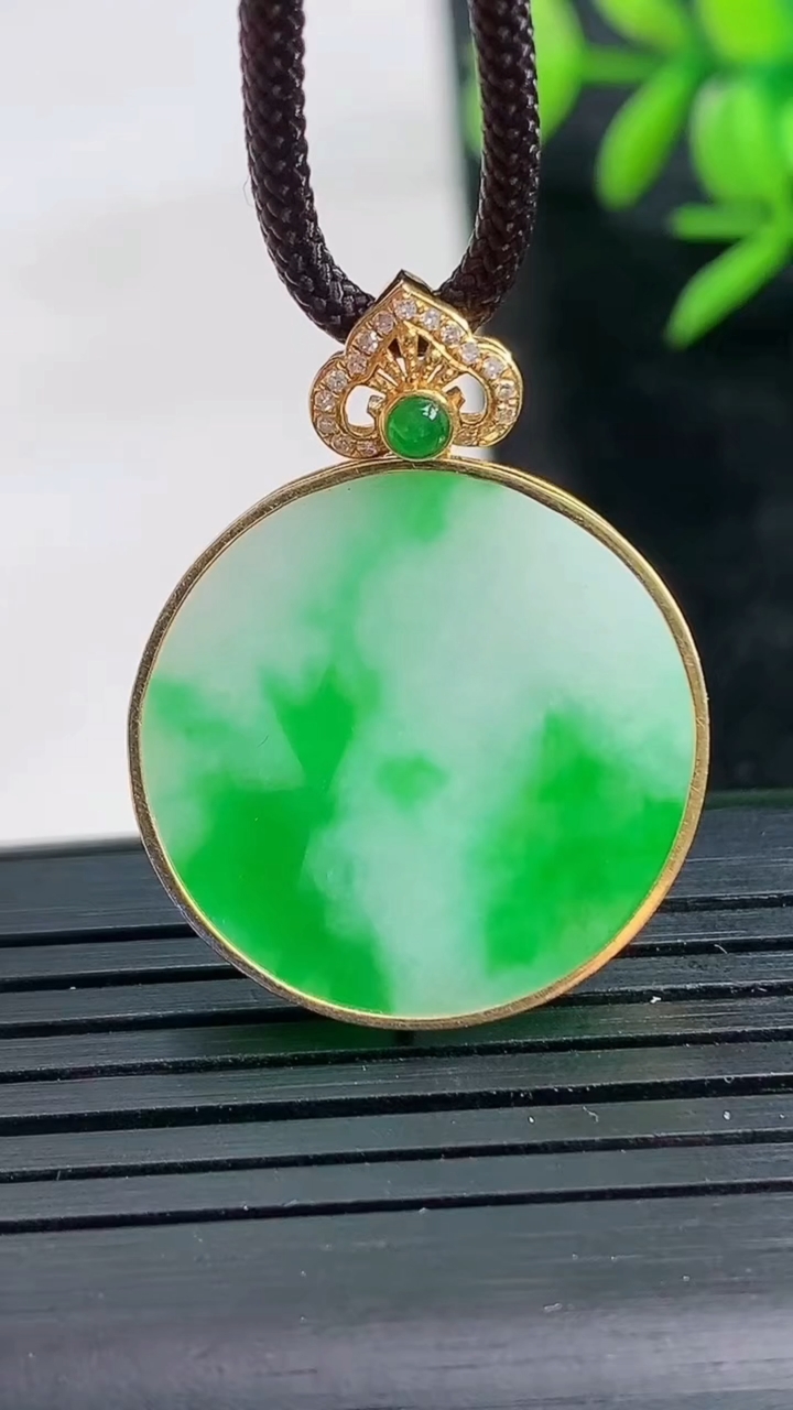 缅甸天然翡翠A货,18k金镶嵌冰飘绿平安扣吊坠,尺寸:整体31/23.6/4.3mm,祼石23.6/4.3mm,重量:5.74g