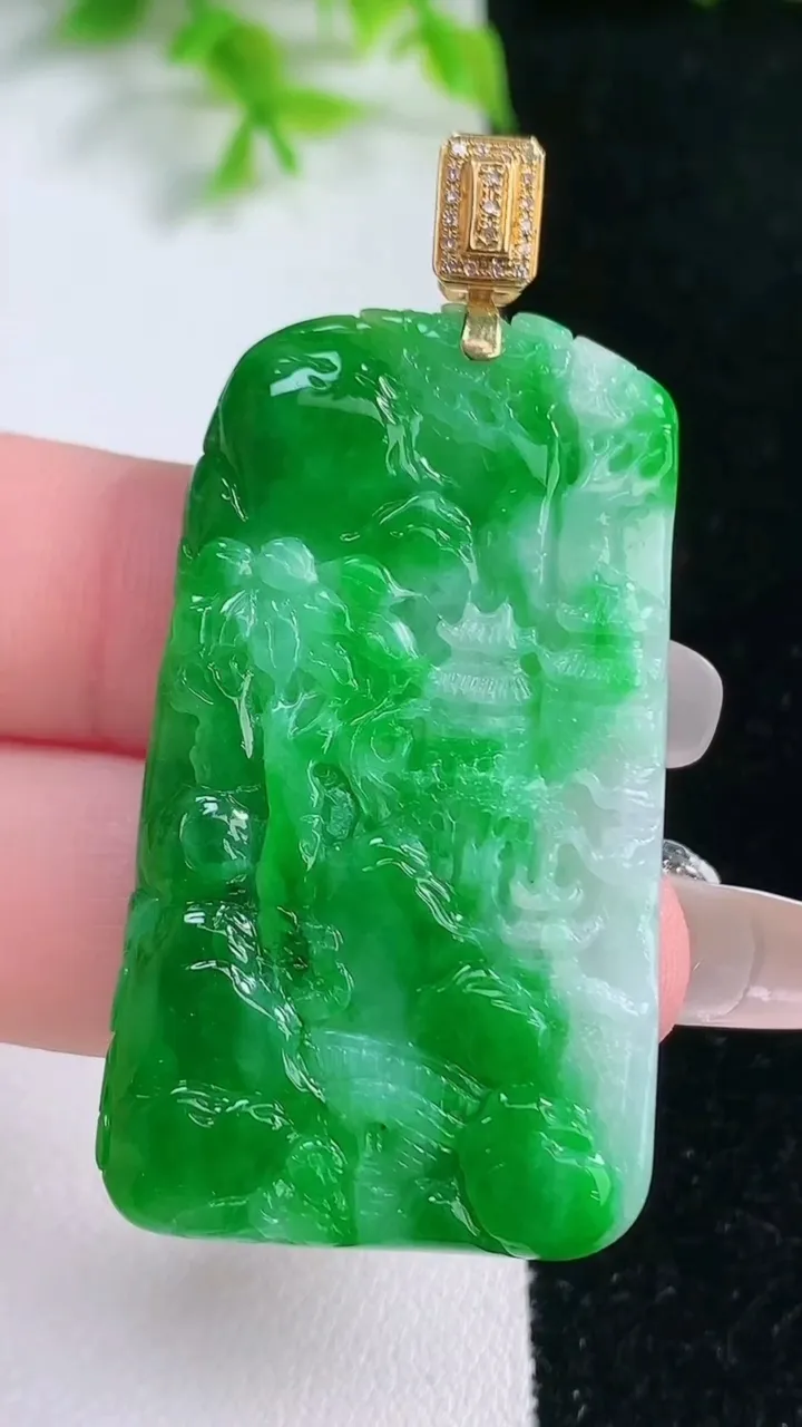 天然A货翡翠山水牌吊坠,尺寸46.5-25.4-4,重量:13.50g 1月17日