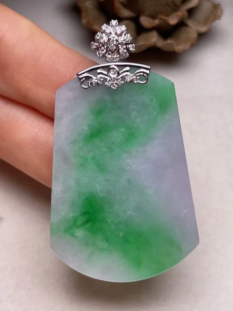 冰糯种飘绿平安无事牌吊坠、真金真钻镶嵌,种水好,玉质细腻 .裸石尺寸 42.7*30.0.