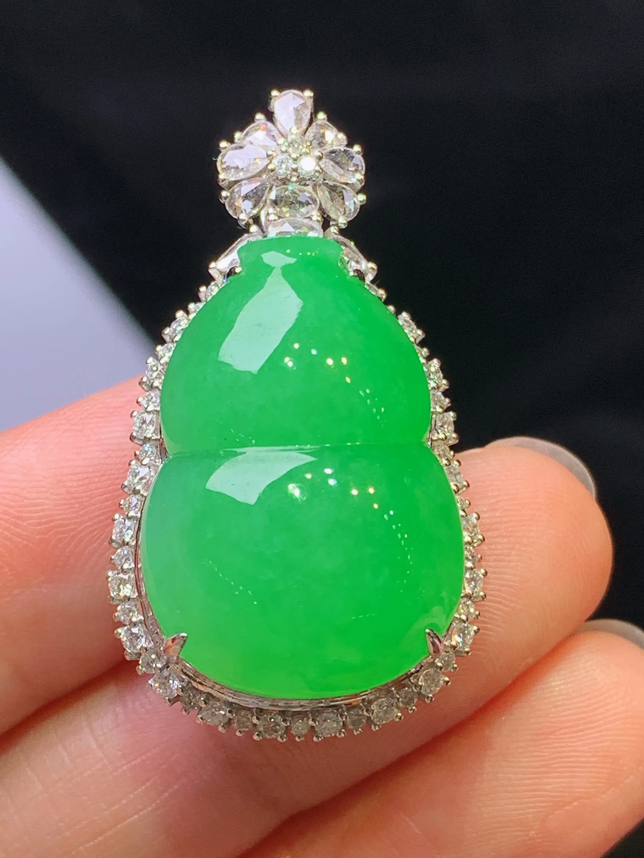 18k金钻镶嵌满绿葫芦吊坠 玉质细腻 色泽艳丽清新 整体尺寸32.3*16.6*10.5