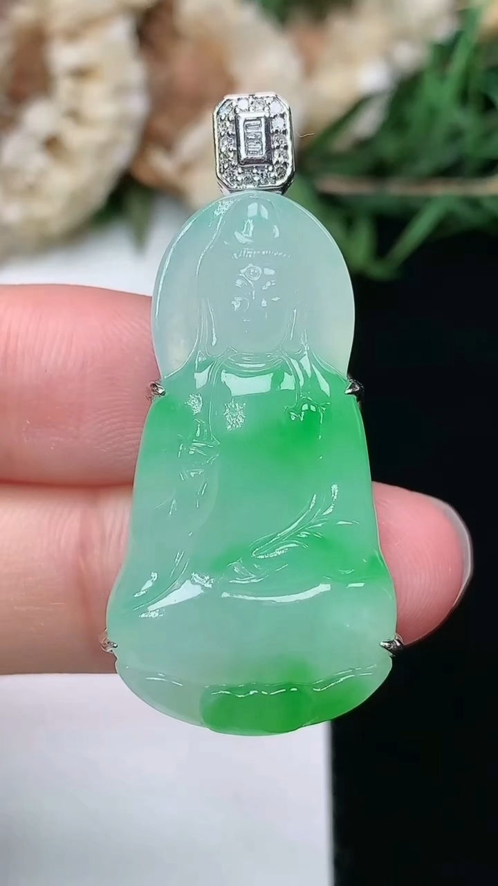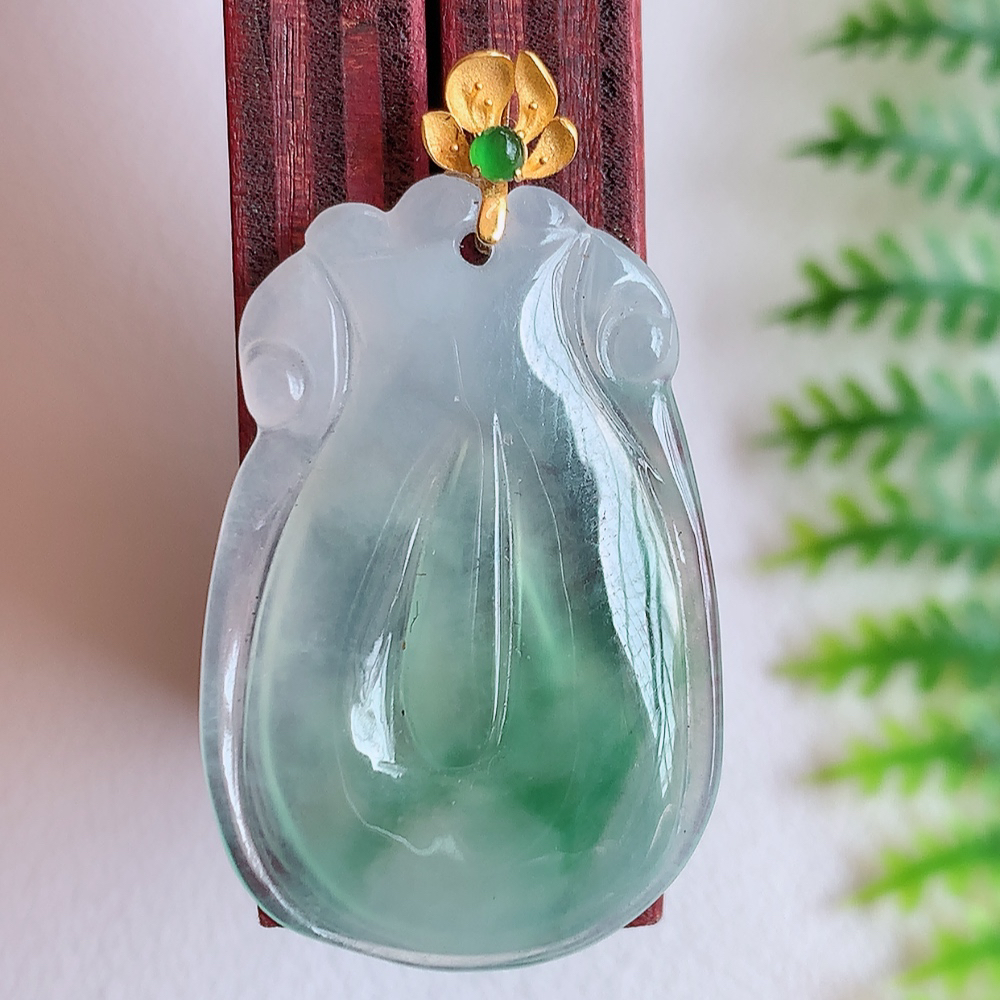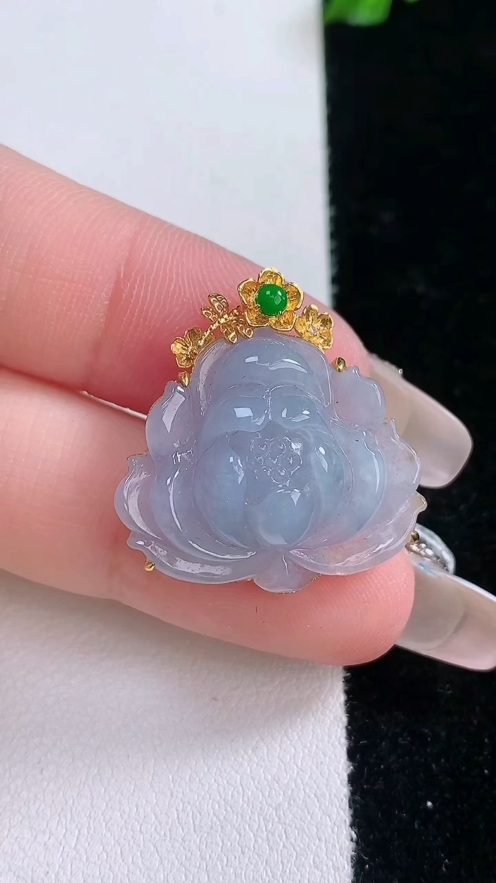 18k金扣冰润莲花翡翠挂件,寓意“祥和,安宁,吉祥,幸福”佛意本悠远,莲花更清幽。意境优美,莹润通透