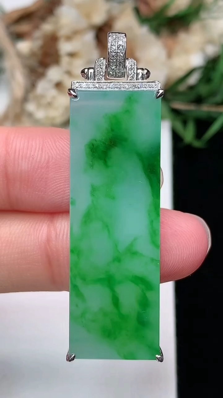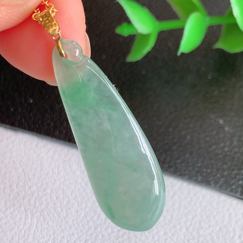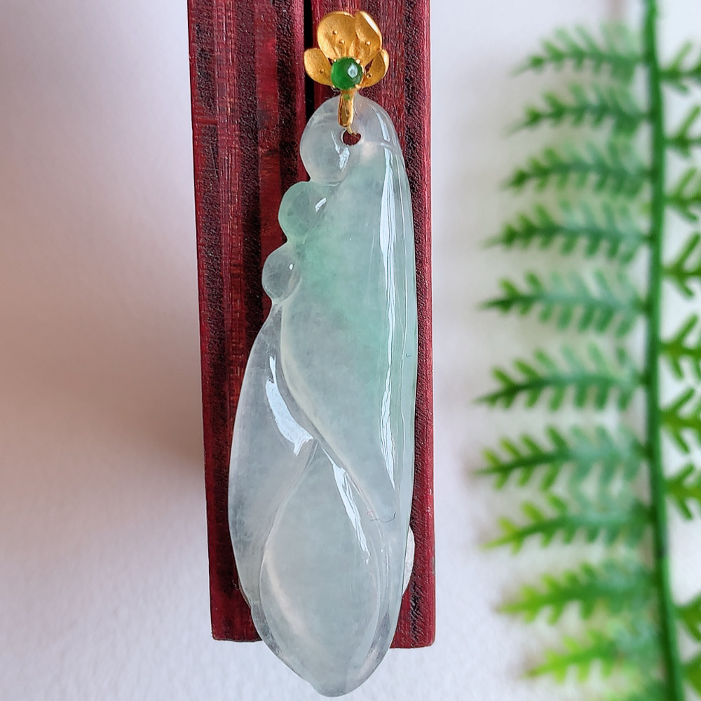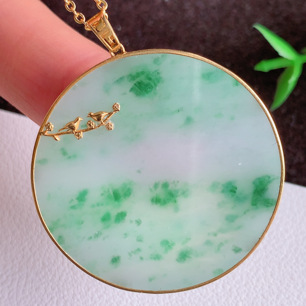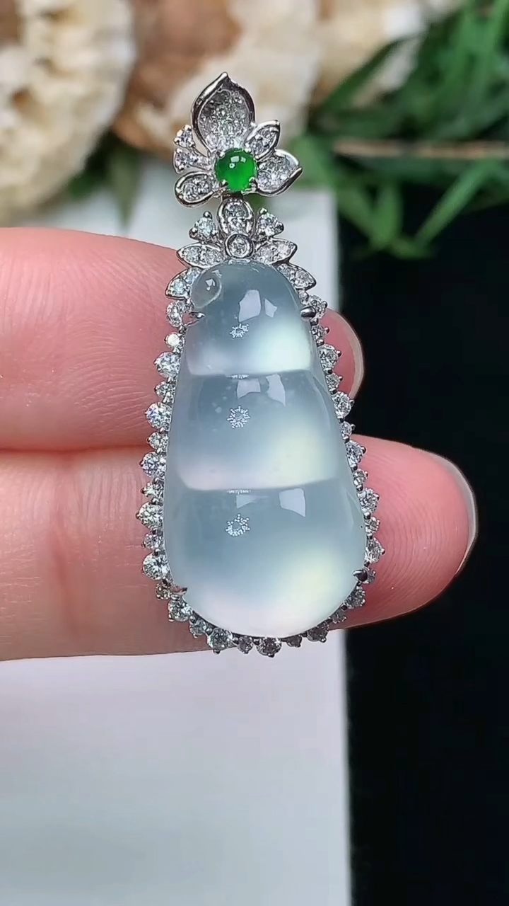 18k金扣冰飘花福贝翡翠吊坠,寓意“辈辈有福,财源广进”水足莹润。通体清新通透,佩戴效果优雅迷人,W
