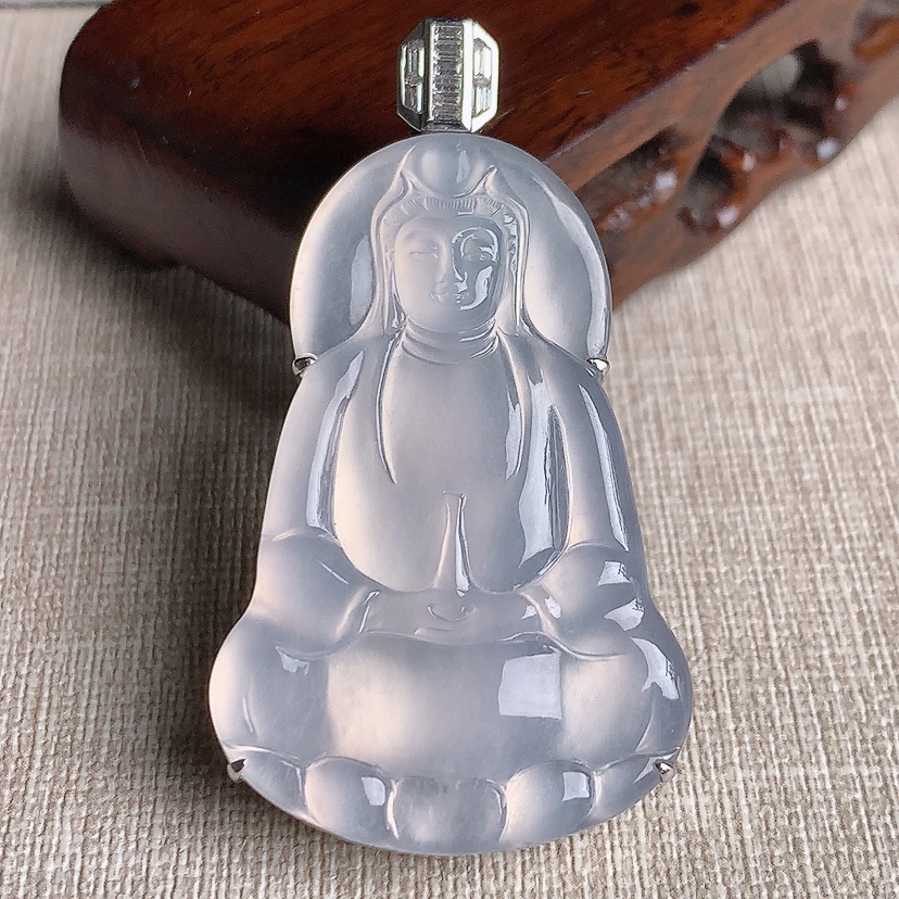 天然A货翡翠18K金伴钻镶嵌白冰白月光正装观音吊坠 尺寸54.8-46.2-30-10mm 重量1