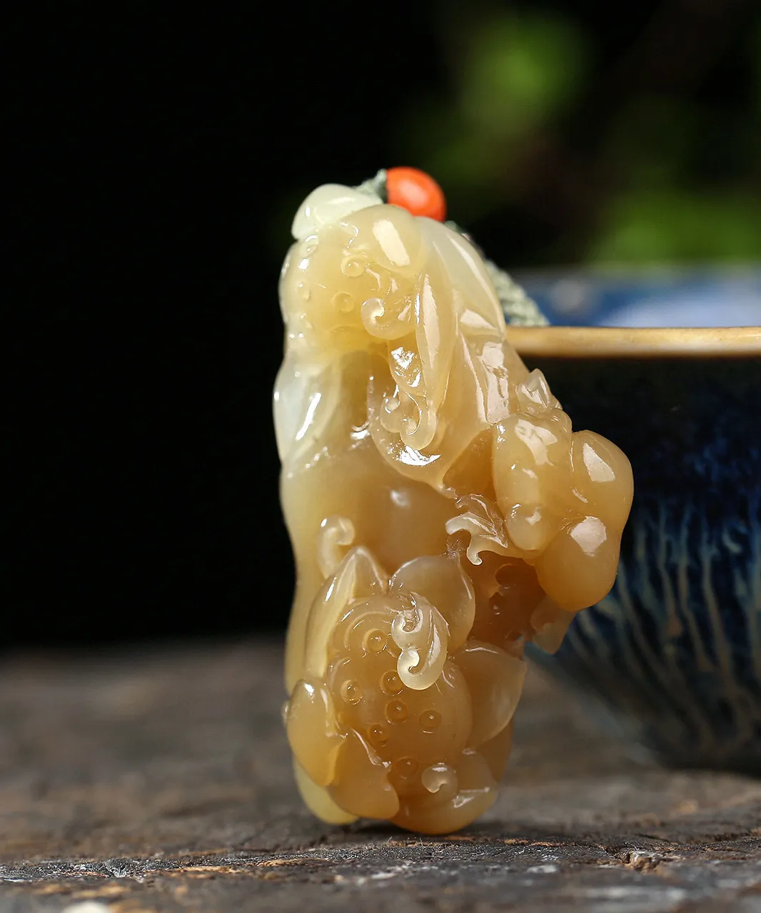 天然和田玉.糖玉.呱呱来财.玉坠.玉质油润.雕琢精美.青蛙趴于荷叶之上.灵动传神.俏皮可爱.优美有趣