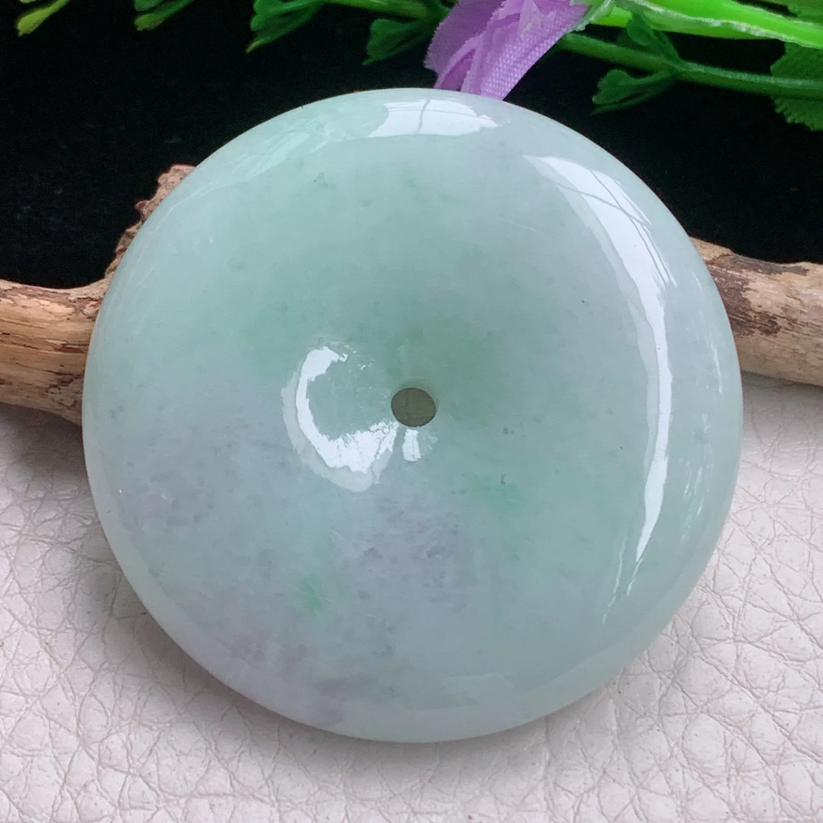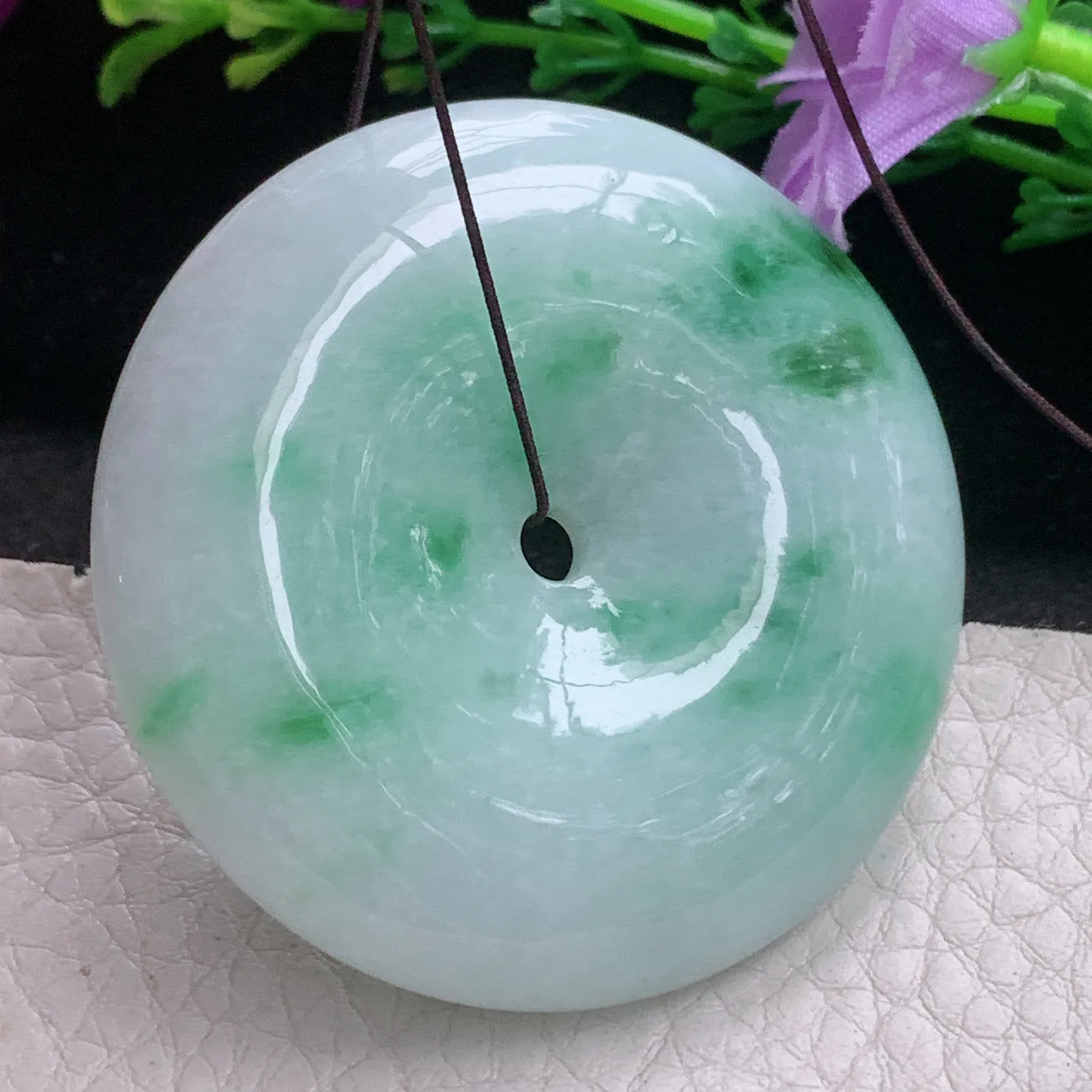 zen自然光49*11.3天然缅甸翡翠A货飘绿花大平安扣 玉扣玉吊坠