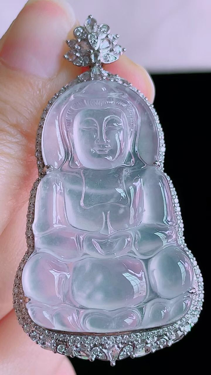 【翡翠名称】18K金豪华镶钻高冰观音吊坠挂件 【翡翠尺寸】含金55.8/29.3/9.2mm 【翡翠