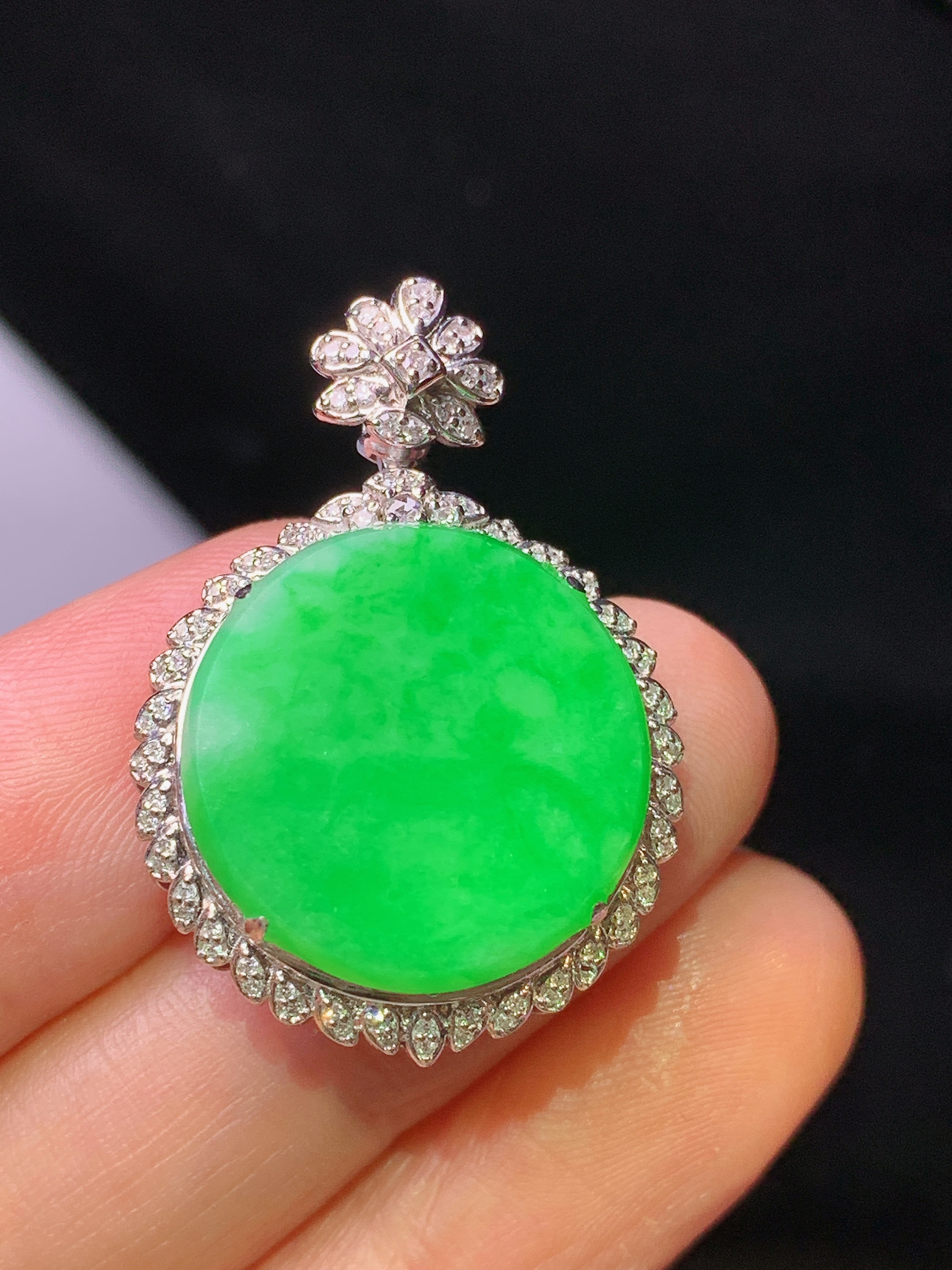 18k金钻镶嵌翠绿圆牌吊坠 玉质细腻 色泽艳丽清新 水润亮眼 整体尺寸31*21.5*8.3y4