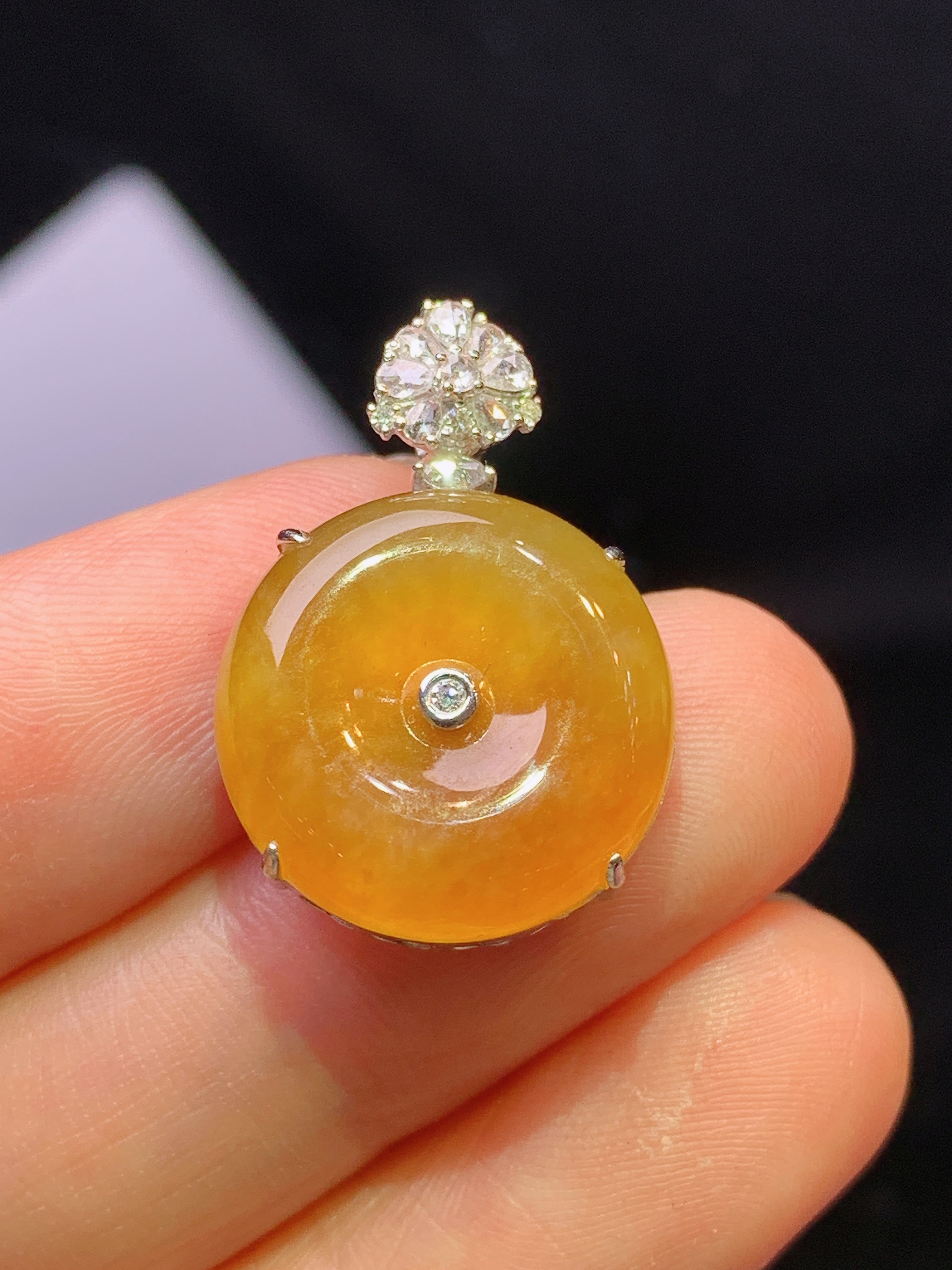 18k金钻镶嵌黄翡平安扣吊坠 玉质细腻 色泽艳丽清新 水润亮眼 整体尺寸24*16.5*7y4