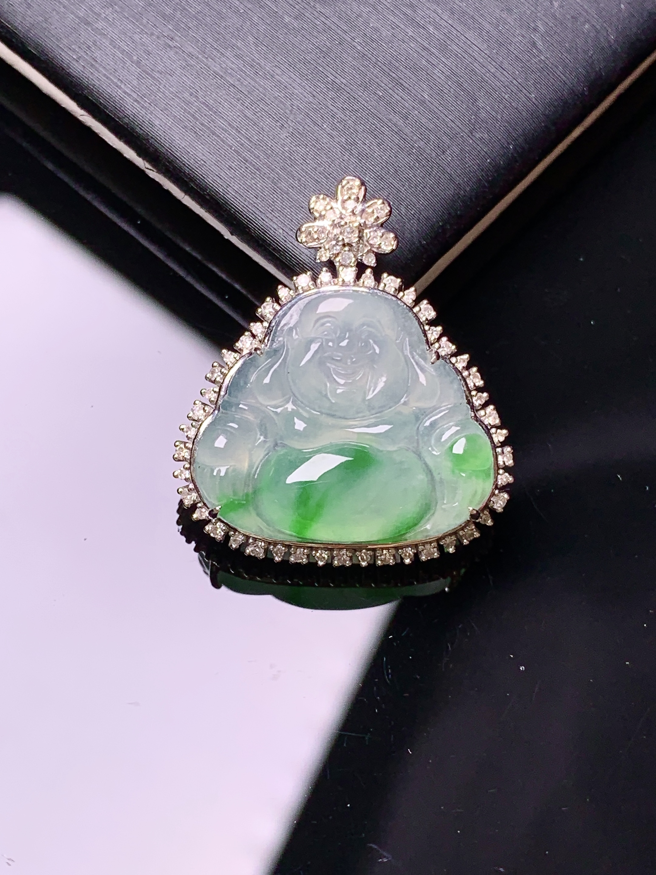 18k金钻镶嵌飘绿佛公吊坠 玉质细腻 色泽艳丽清新 水润亮眼 整体尺寸24.3*21.2*8y4