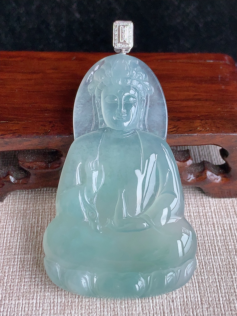 天然A货翡翠18K金伴钻镶嵌晴水一刀切素衣观音吊坠 尺寸70.2-61.5-37.7-5.5mm