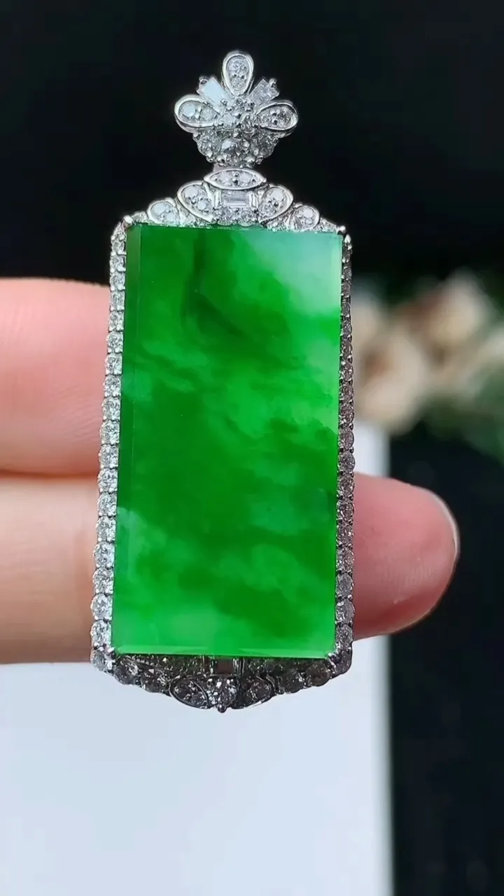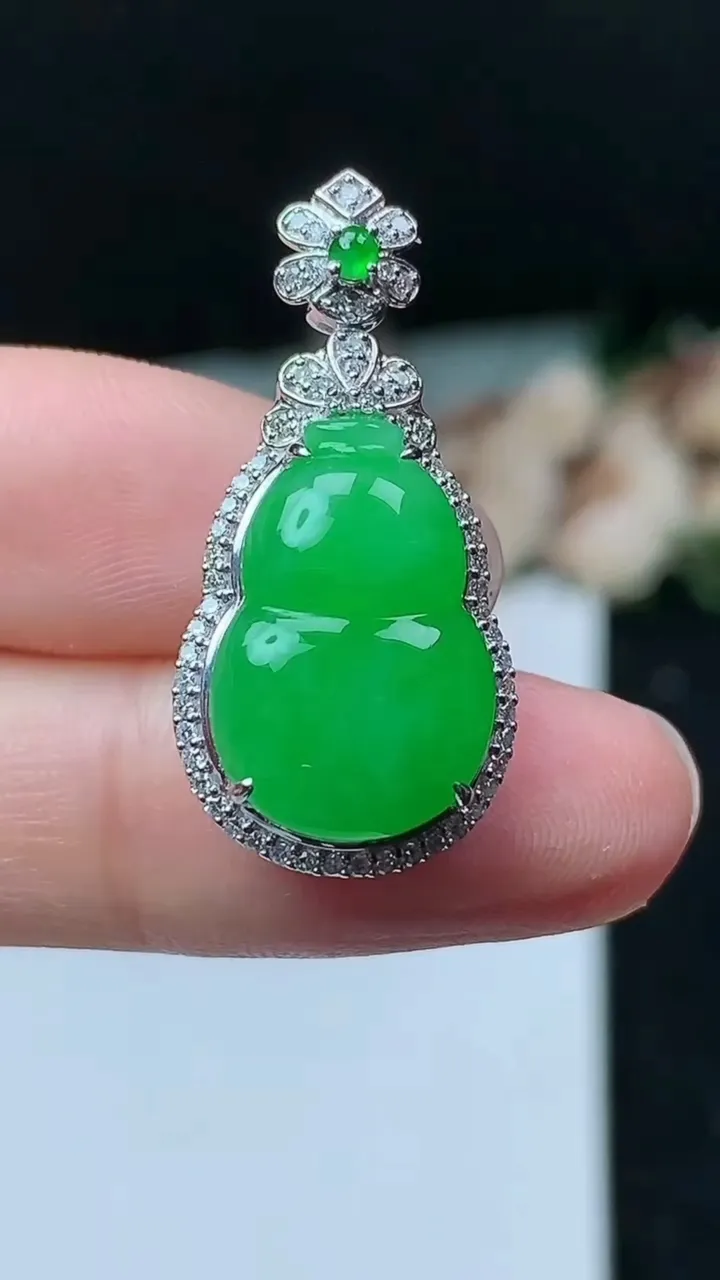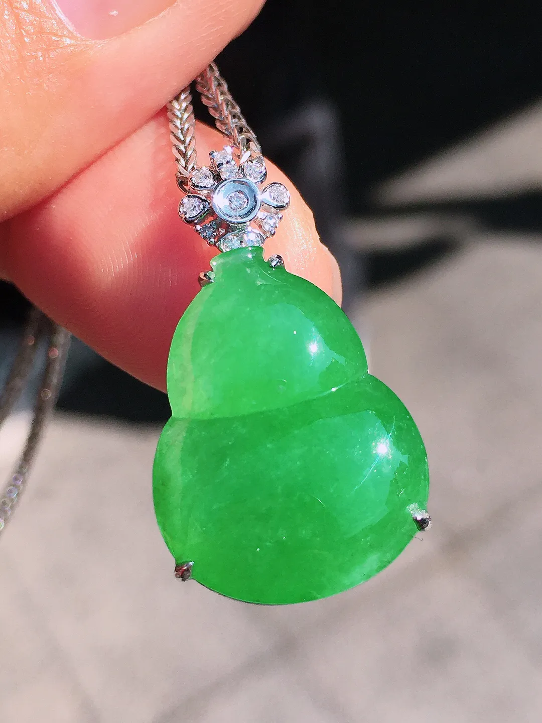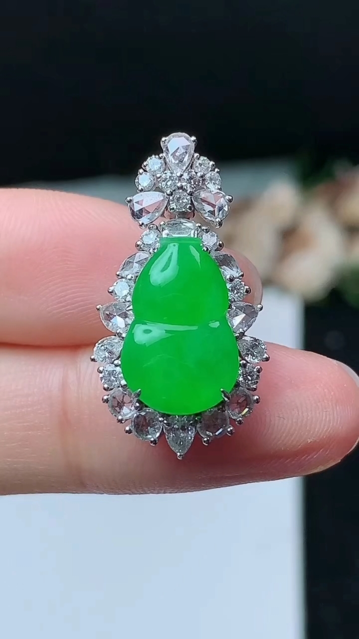 18k金钻镶嵌满绿葫芦吊坠 玉质细腻 色泽清新艳丽 整体尺寸40*22.5*16.7