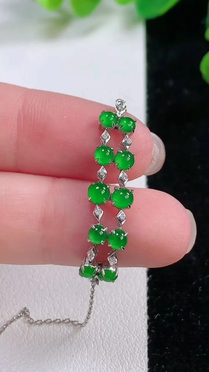 阳绿福豆吊坠,色泽均匀艳丽,玉质细腻,荧光感超 强,饱满圆润,尽显优雅气质,18k 金豪华镶嵌