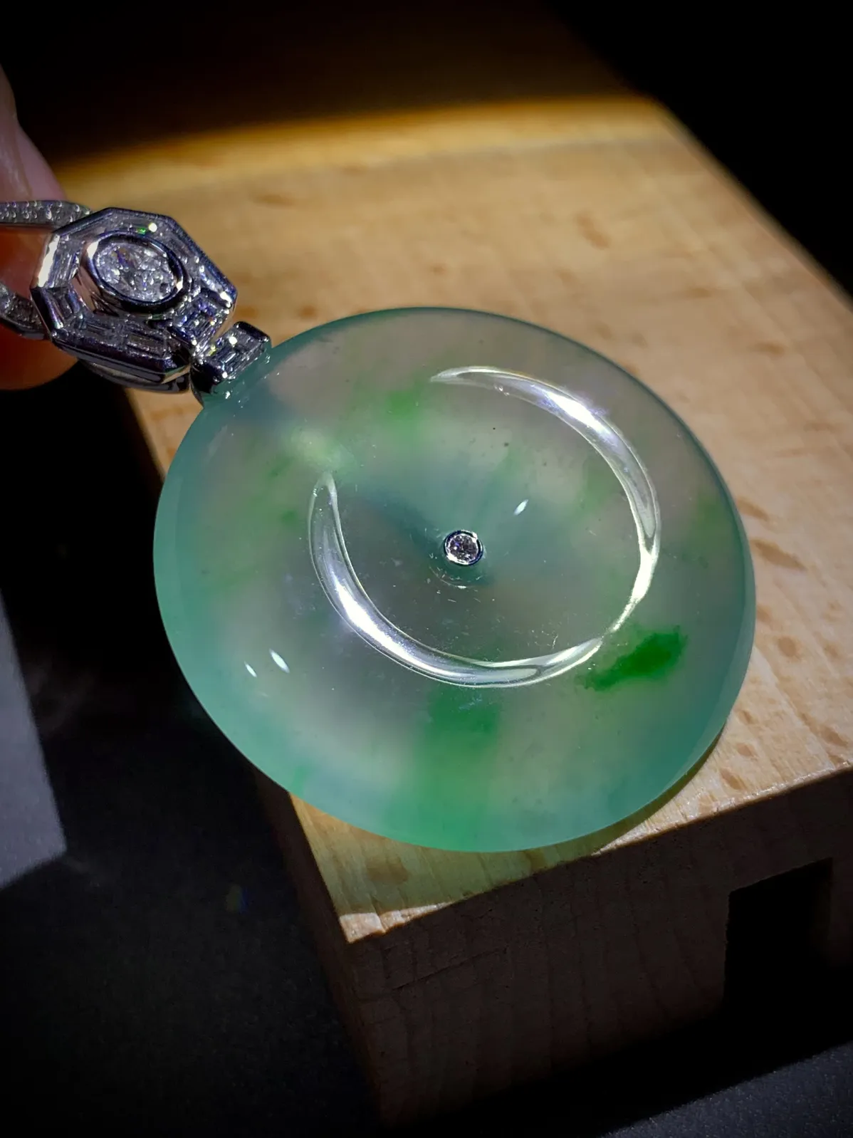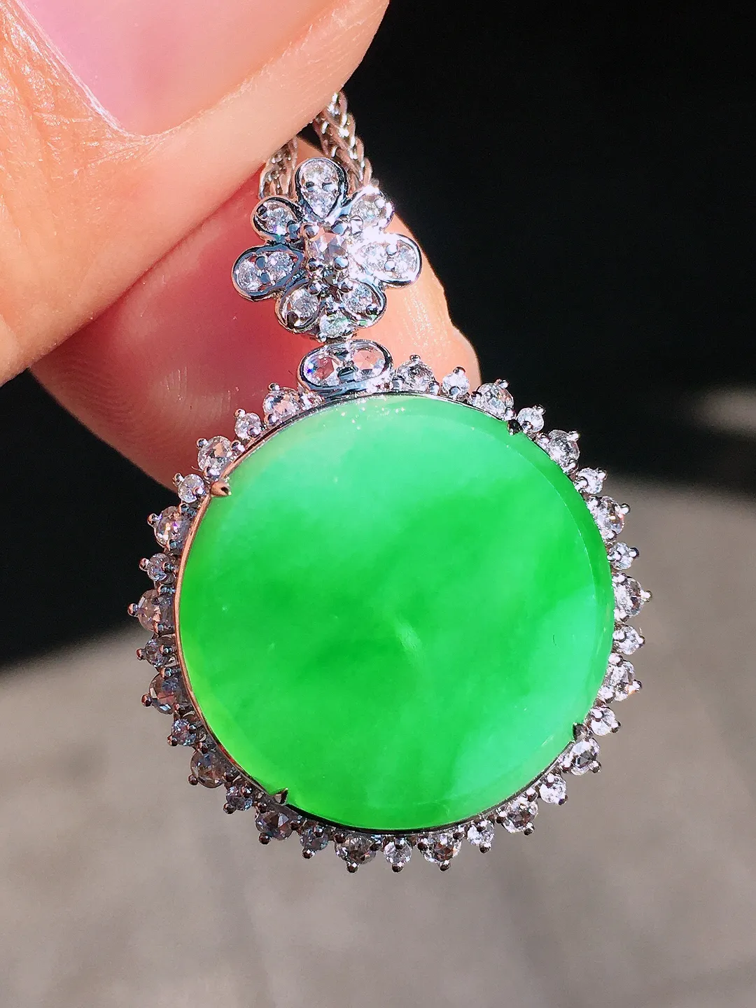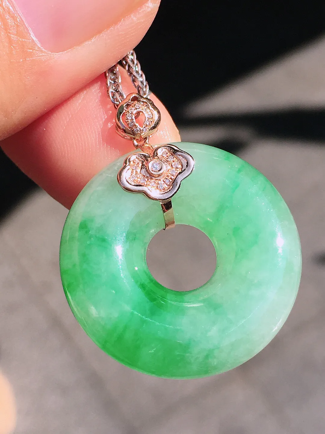 18k金钻镶嵌冰种平安扣吊坠 玉质细腻 色泽清新艳丽 整体尺寸38.6*27*4.8