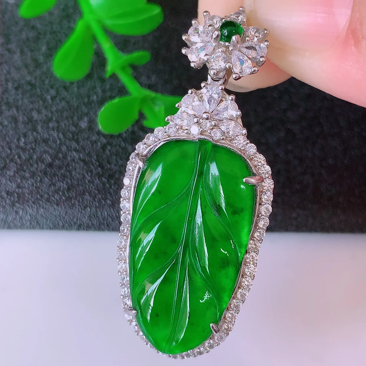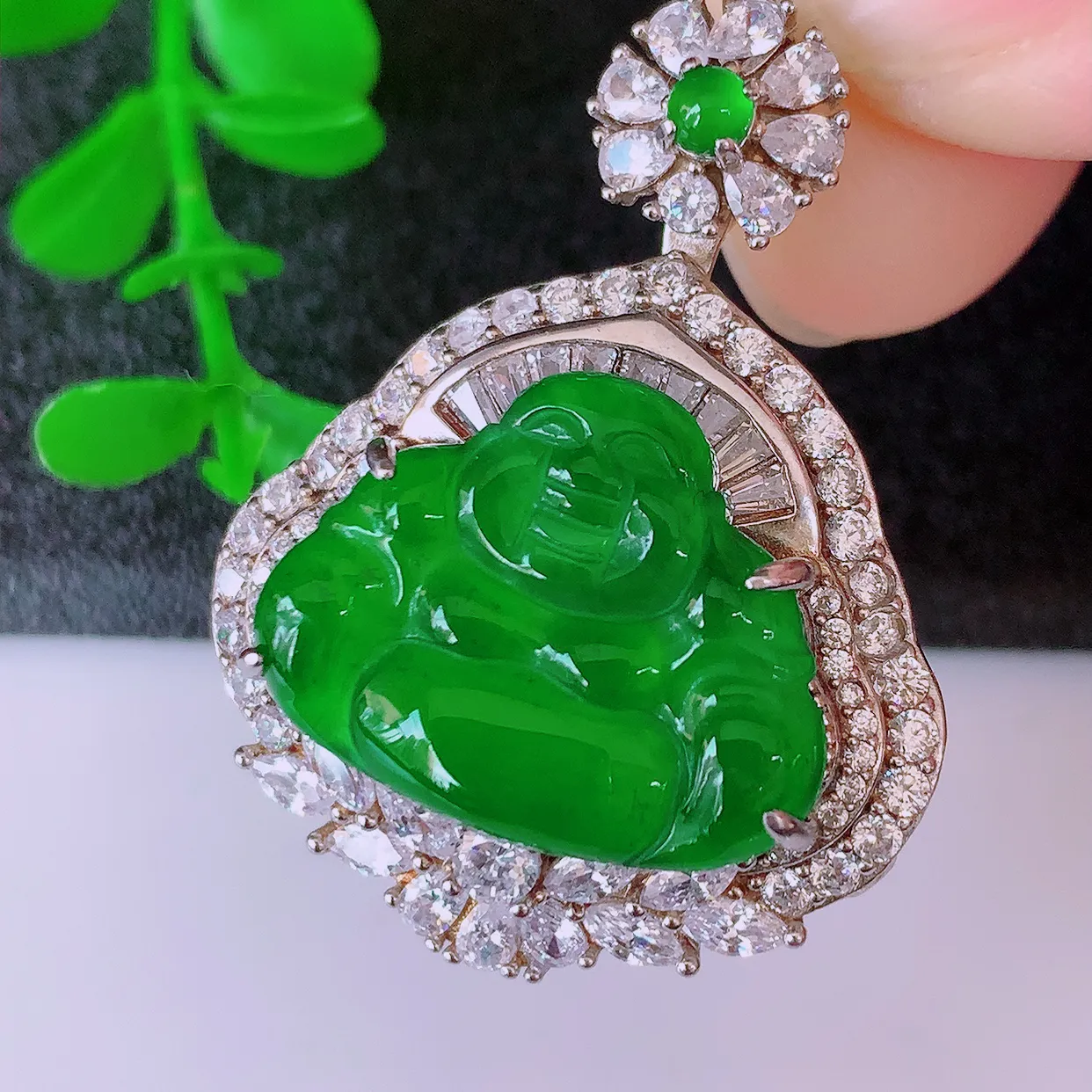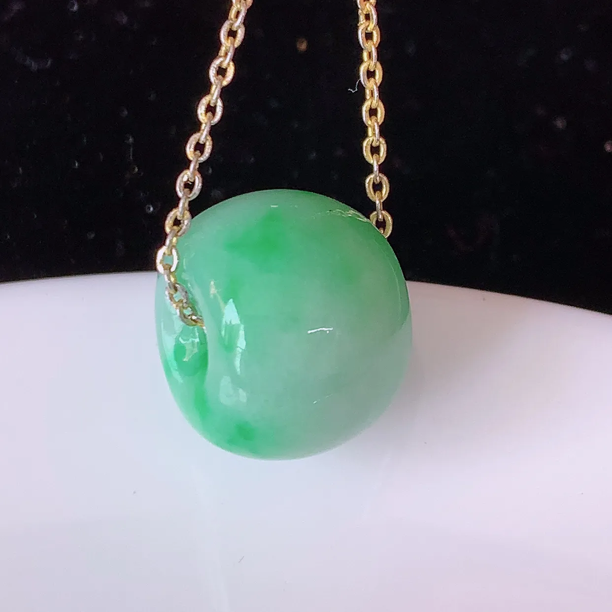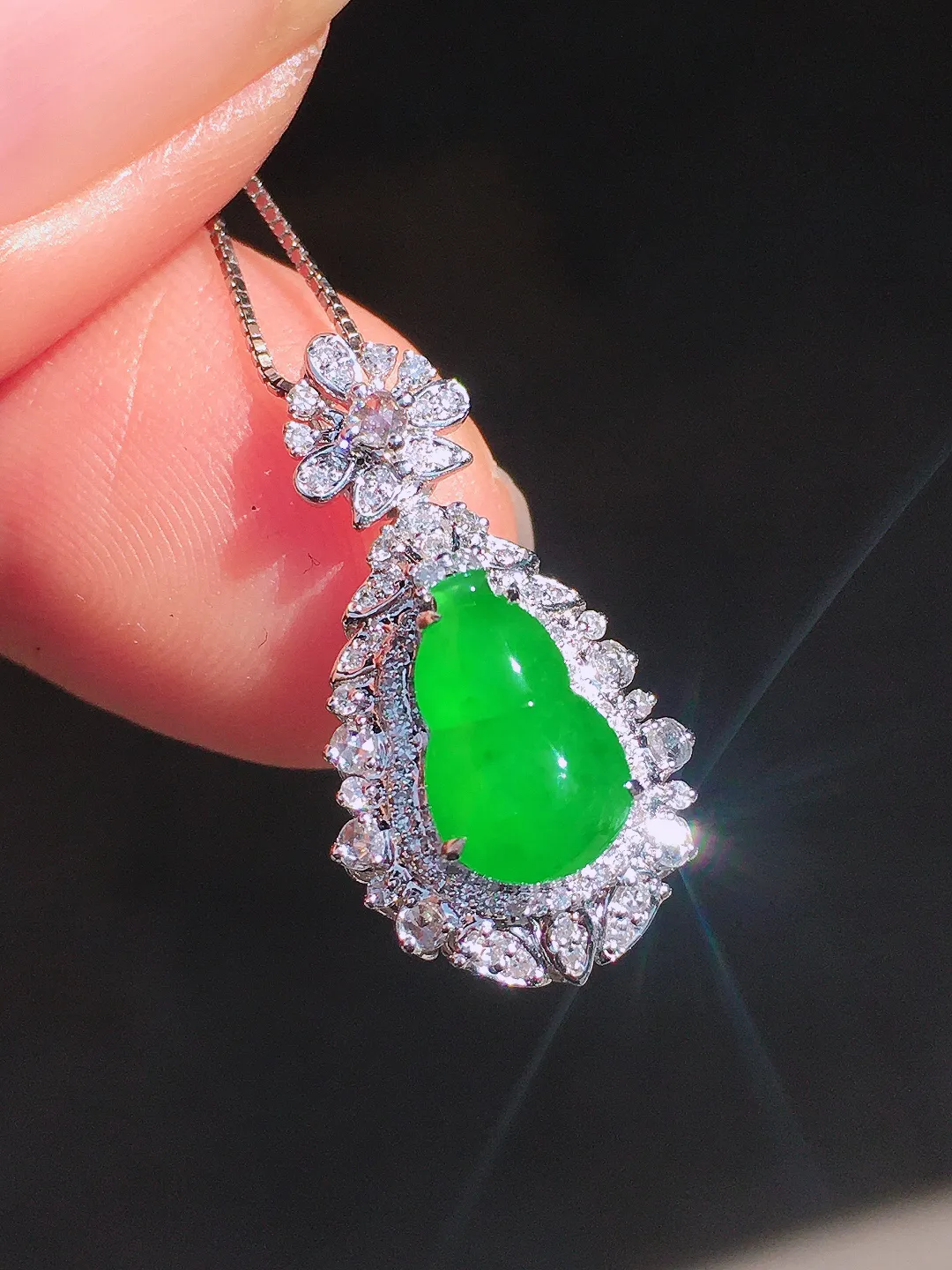 阳绿葫芦吊坠,色泽均匀艳丽,玉质细腻,荧光感超 强,饱满圆润,尽显优雅气质,18k 金豪华镶嵌