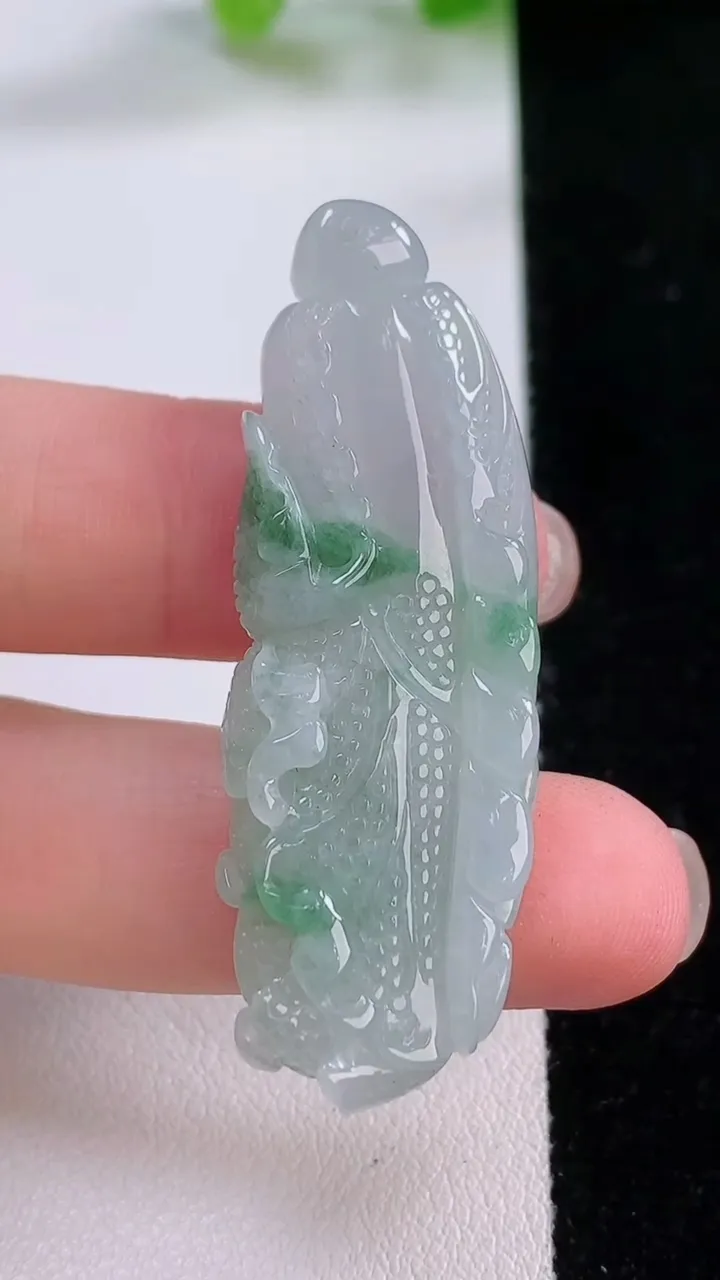 天然A货翡翠种白冰白菜吊坠,尺寸35.7-15.8-7,重量:5.68g 12月3日
