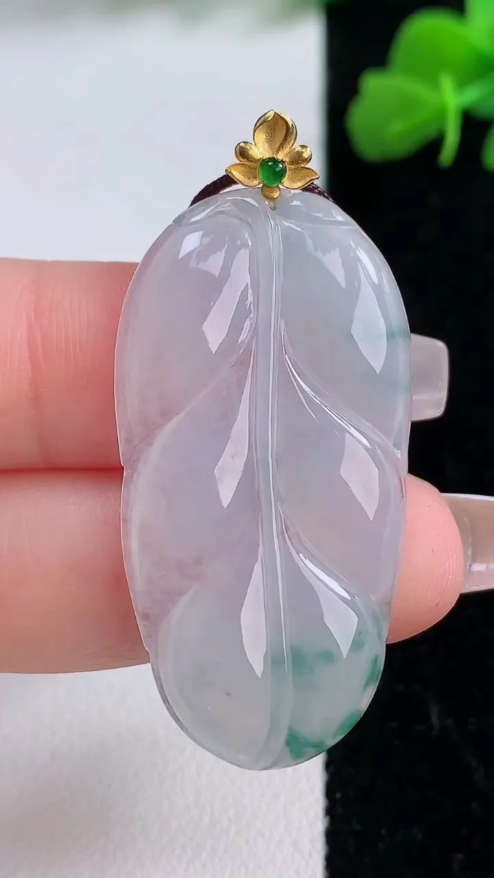 【冰种飘绿叶子】金枝玉叶,质地细腻,冰润透亮,光泽出众,18k金钻镶嵌,裸石尺寸17.8*12.5*
