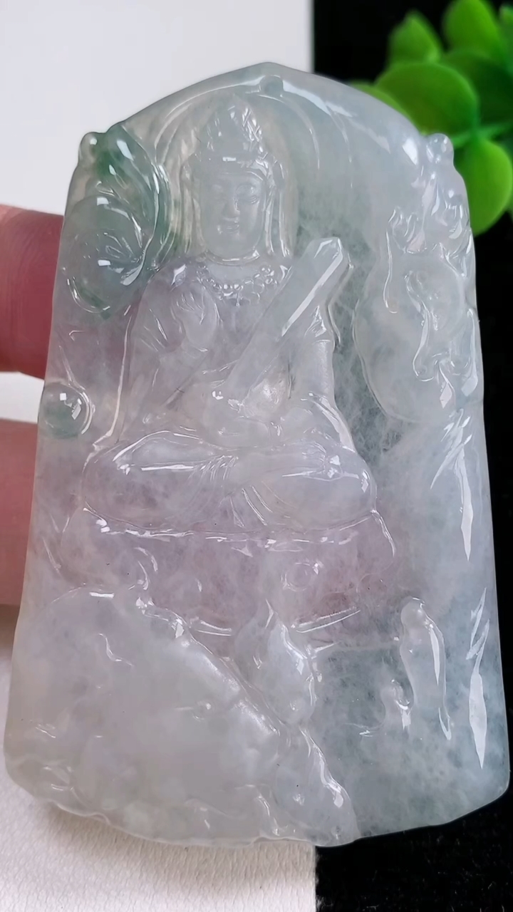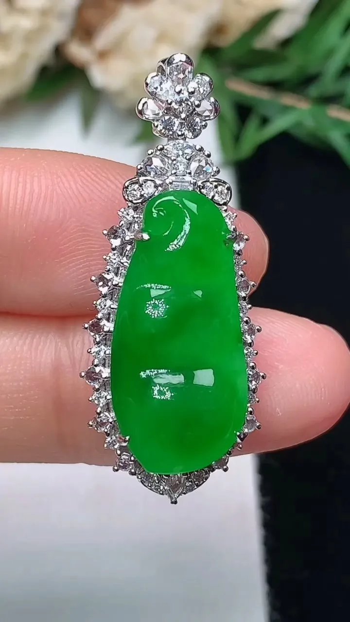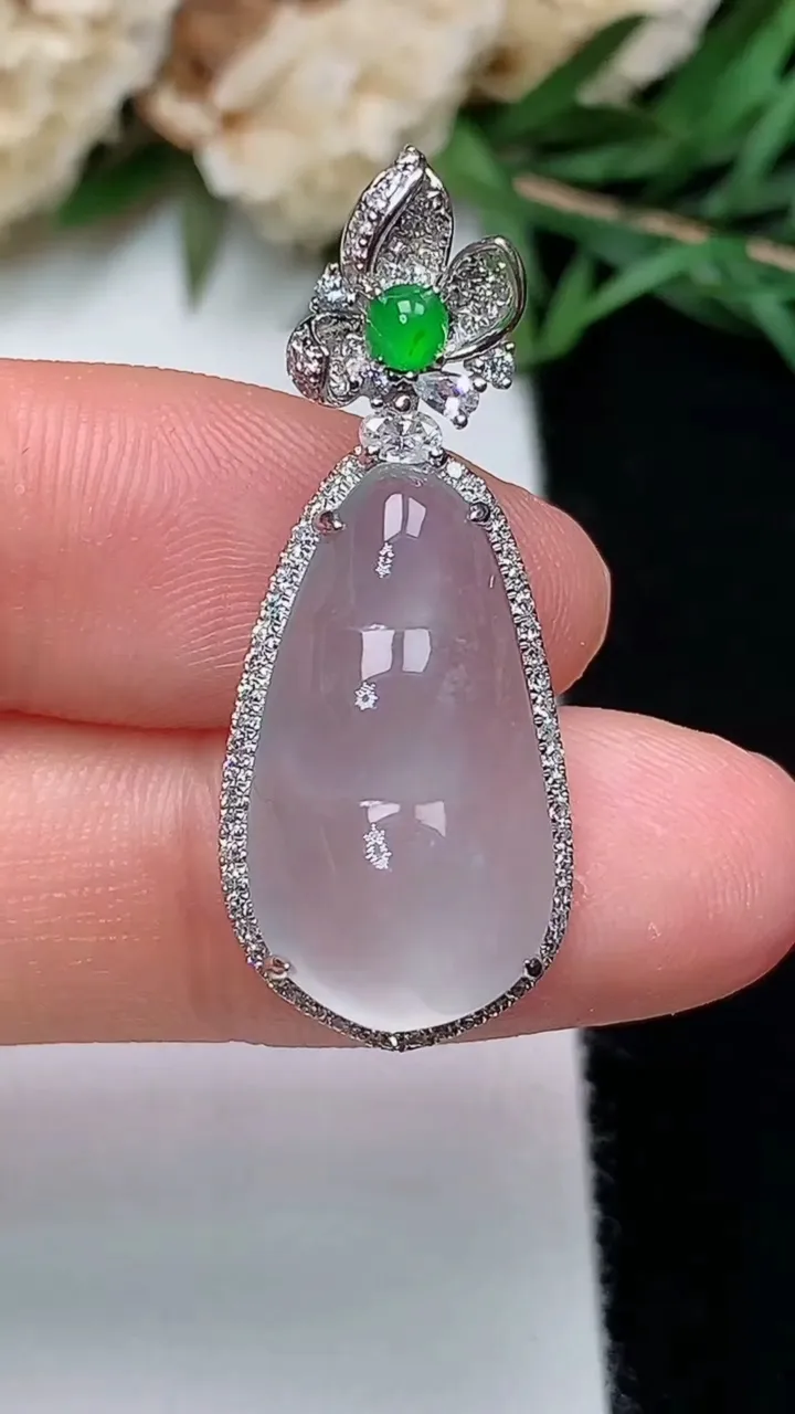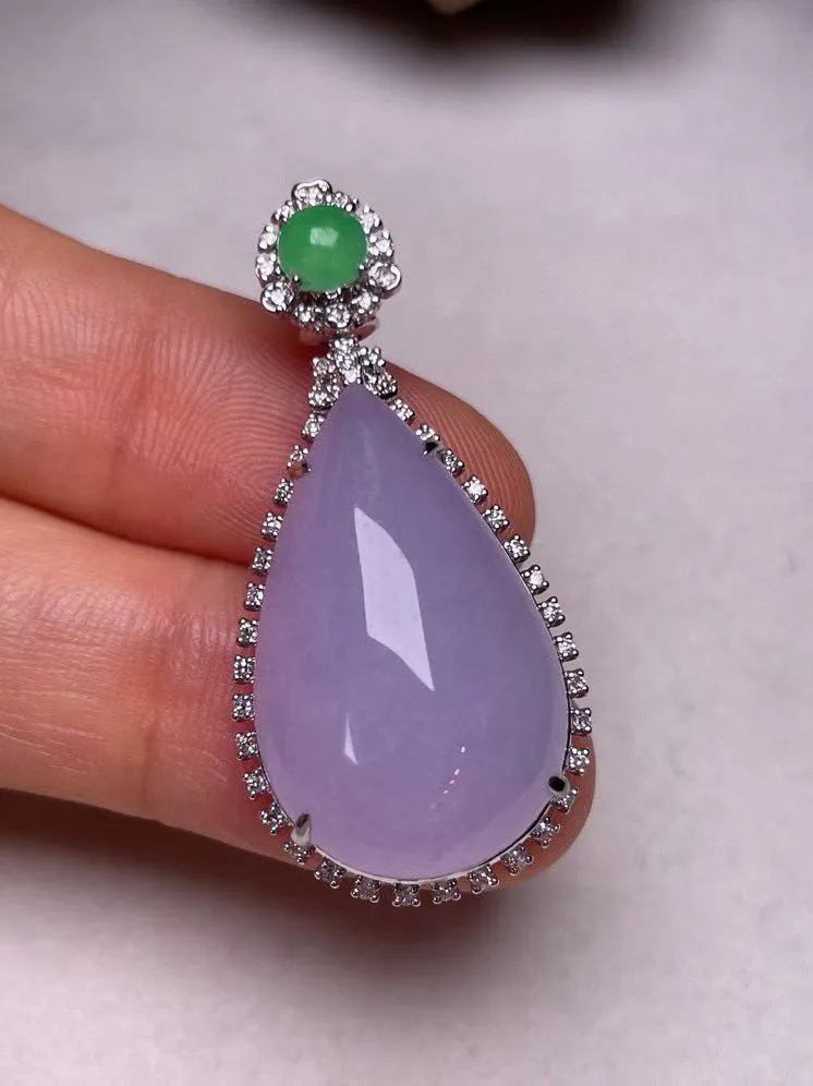 冰糯种紫罗兰滴水吊坠、真金真钻镶嵌,种水好,玉质细腻 .裸石尺寸 24.6*15.5