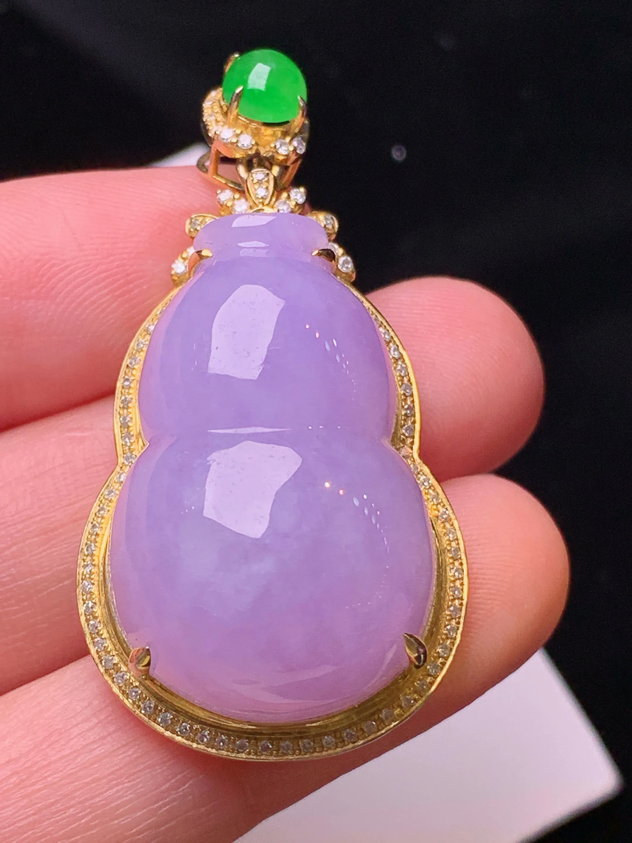 18k金钻镶嵌紫罗兰葫芦吊坠 玉质细腻 色泽清新艳丽 整体尺寸42.5*22.5*14