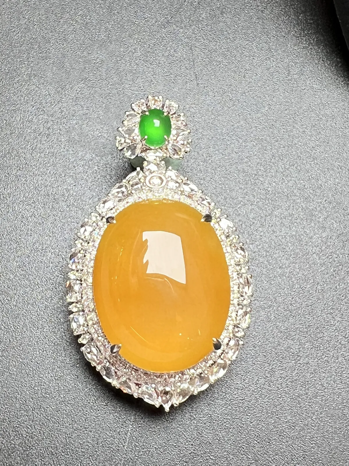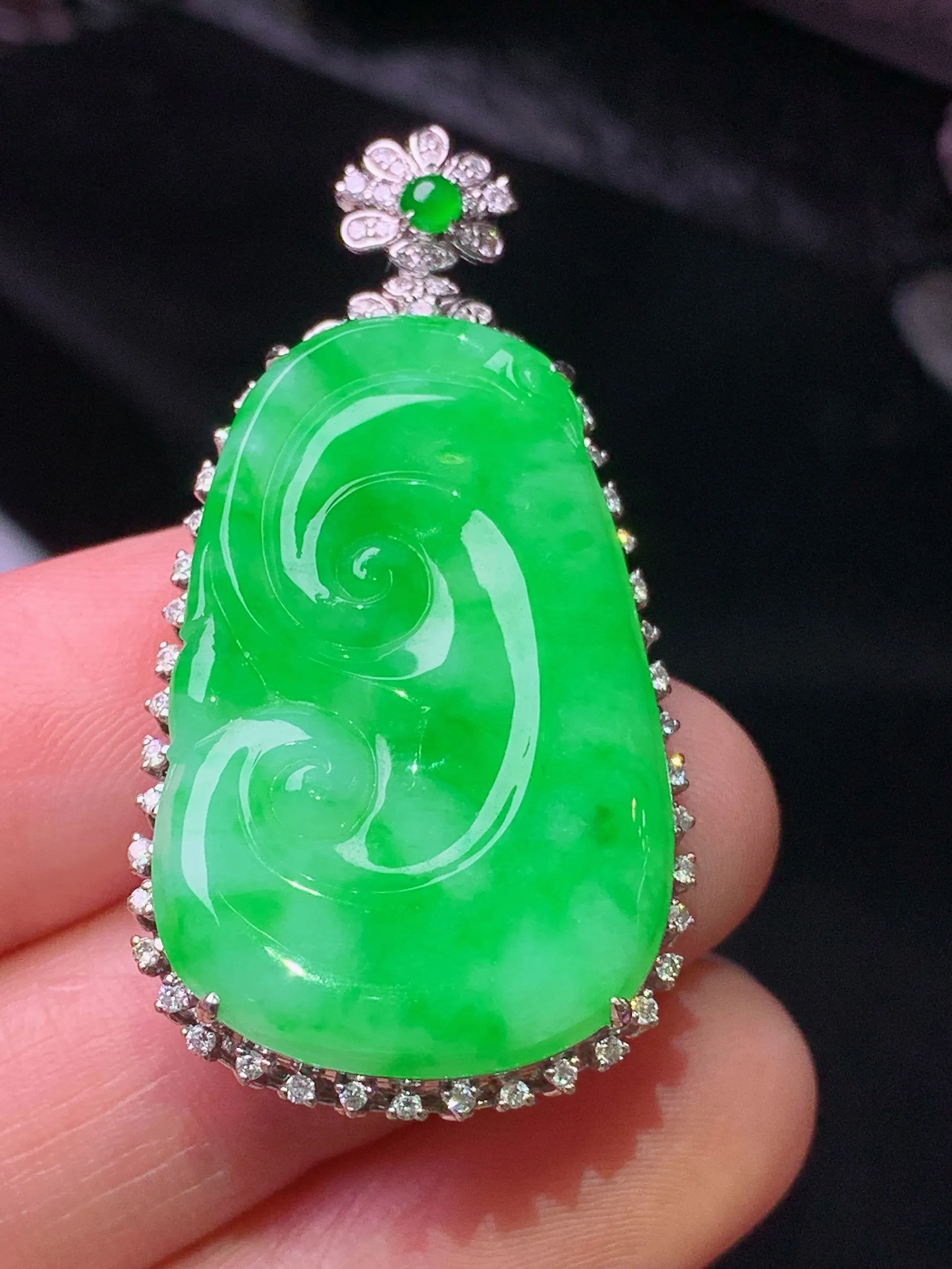 18k金钻镶嵌翠绿如意吊坠 玉质细腻 色泽清新艳丽 整体尺寸42.2*22*8.3