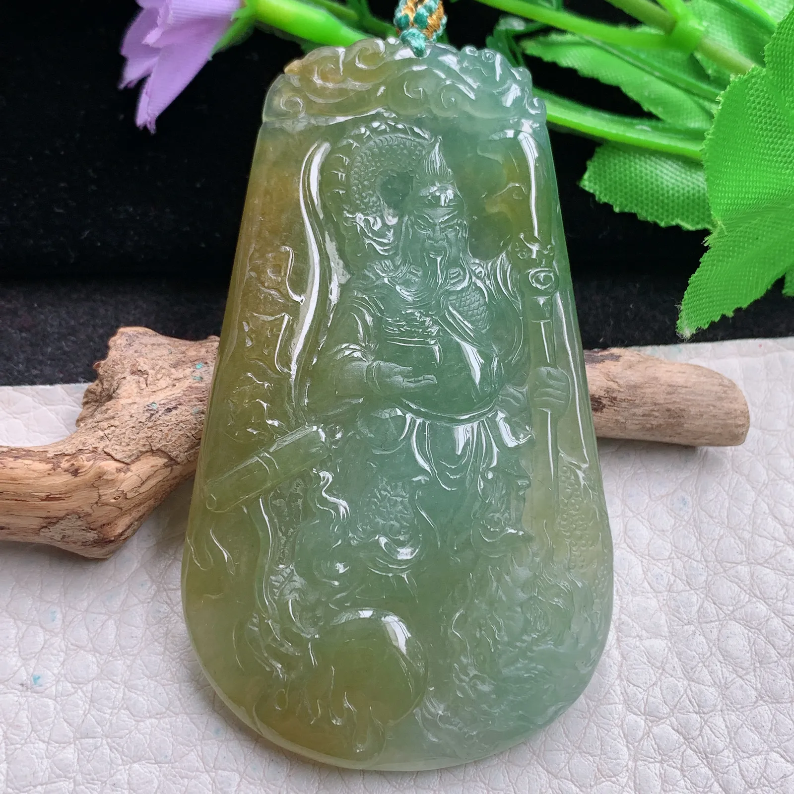 yn实拍74.8*43*5.8缅甸翡翠a货精雕黄加绿御龙关公 玉关公玉吊坠 玉挂件