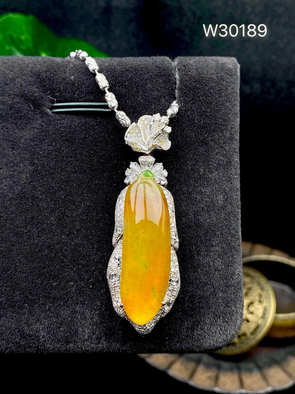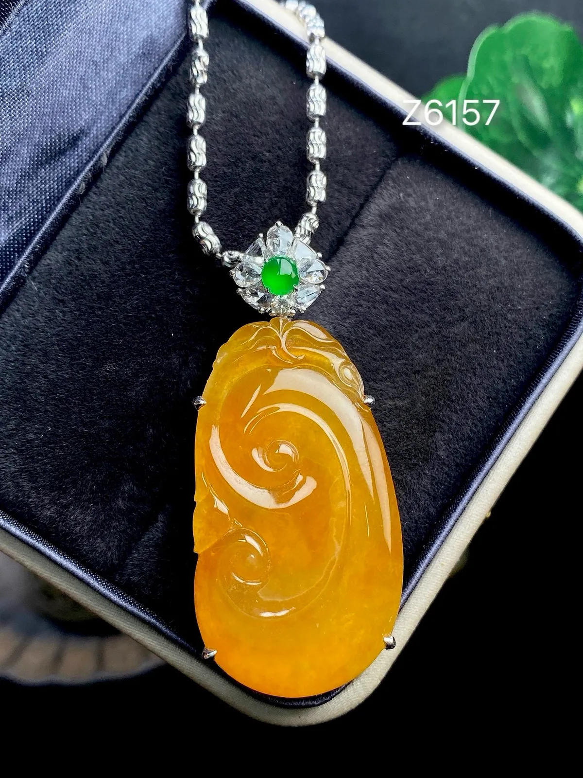 【冰种黄翡如意吊坠】种水很好,颜色漂亮,浓郁纯正,上身佩戴效果上佳,冰润通透,晶莹闪亮,18K金钻镶