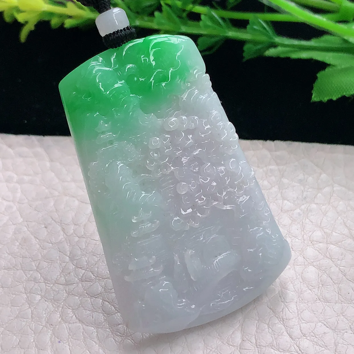 mut自然光53.2*34.8*6.8天然缅甸翡翠白底青山水 大好河山玉吊坠 玉挂件