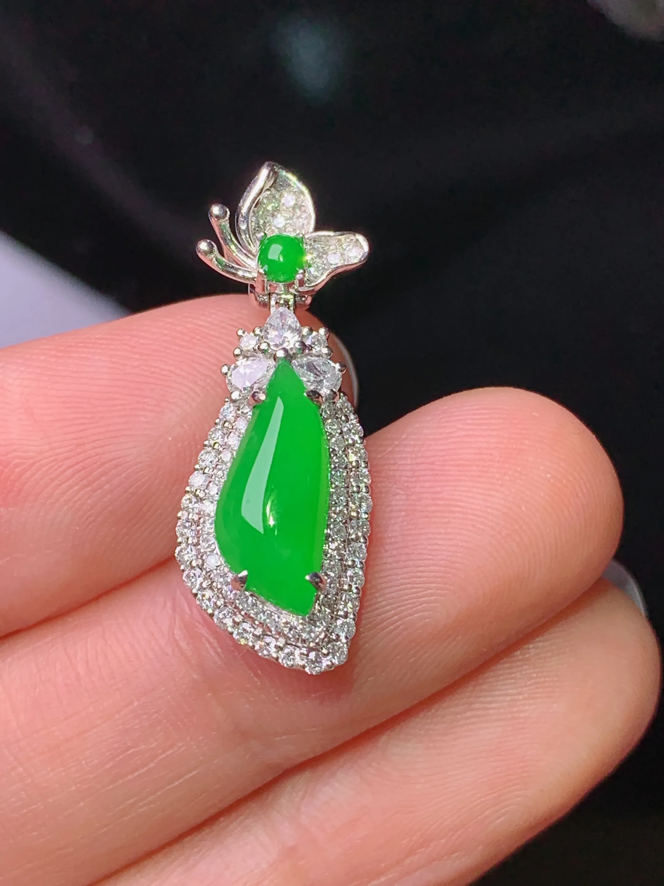 18k金钻镶嵌满绿随形吊坠 玉质细腻 色泽清新艳丽 整体尺寸26.6*9.8*7.2