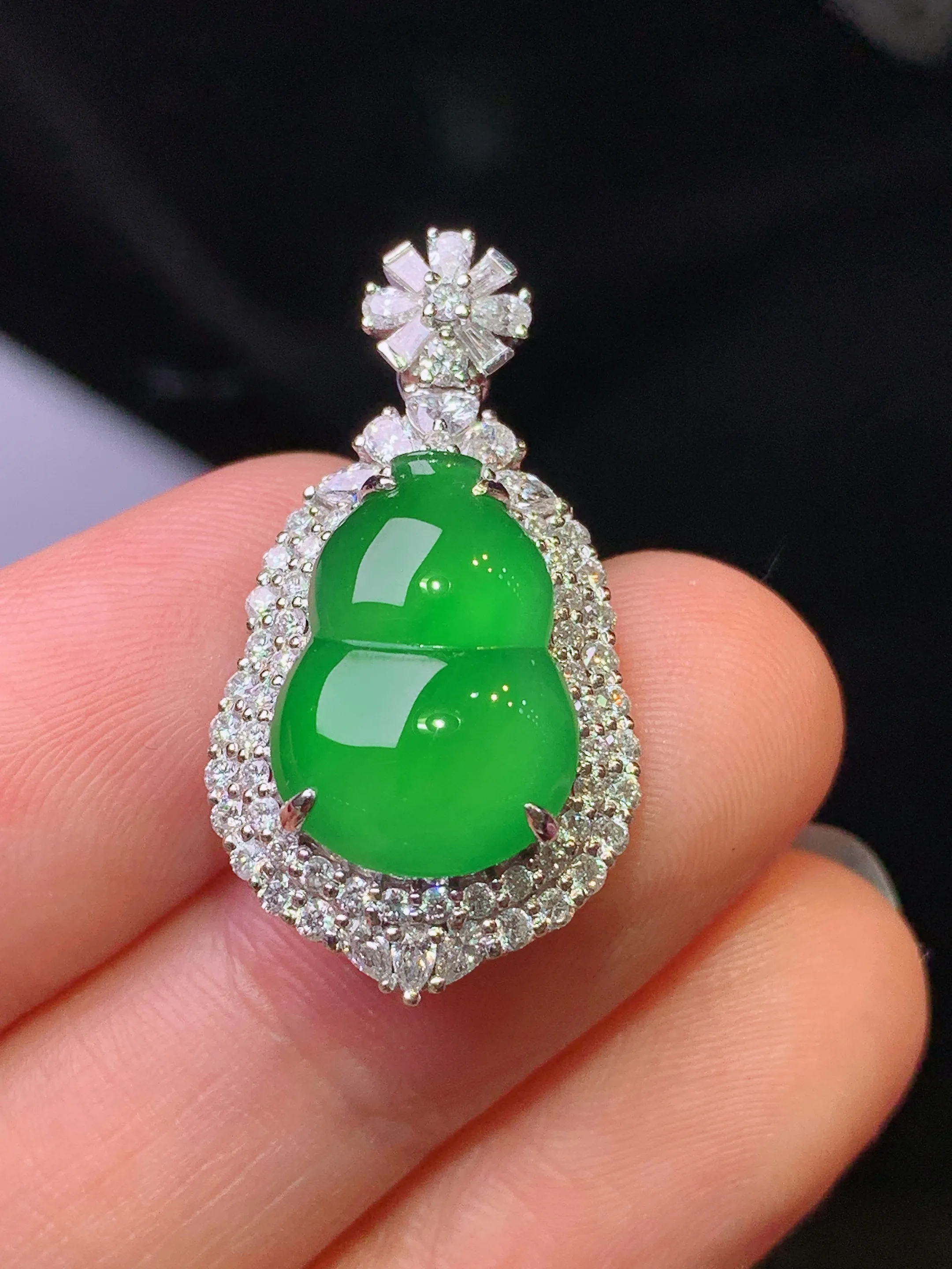 18k金钻镶嵌满绿葫芦吊坠 玉质细腻 色泽清新艳丽 整体尺寸28*15.2*9.2