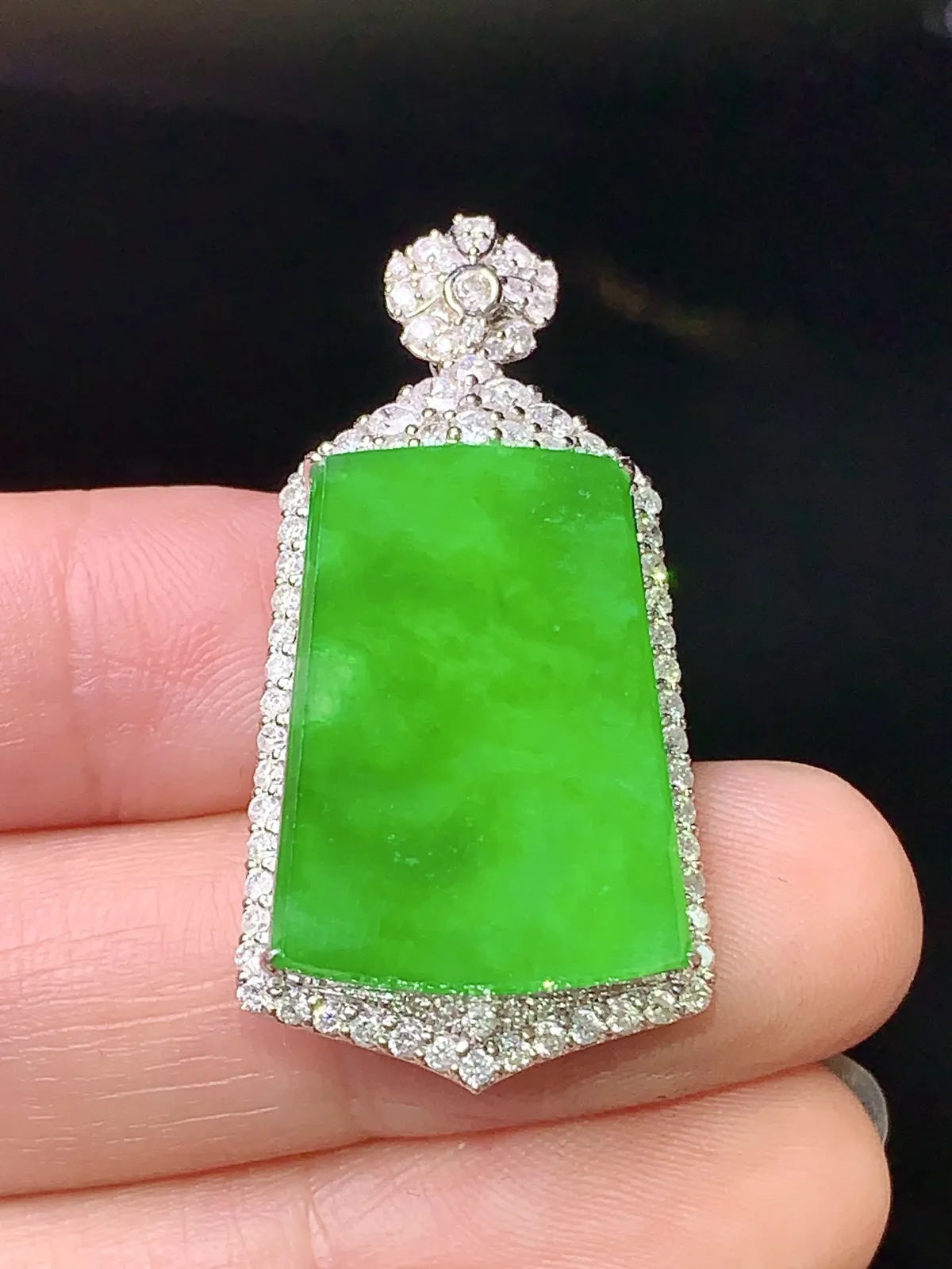 18k金钻镶嵌翠绿无事牌吊坠 玉质细腻 色泽清新艳丽 整体尺寸37*18.3*8