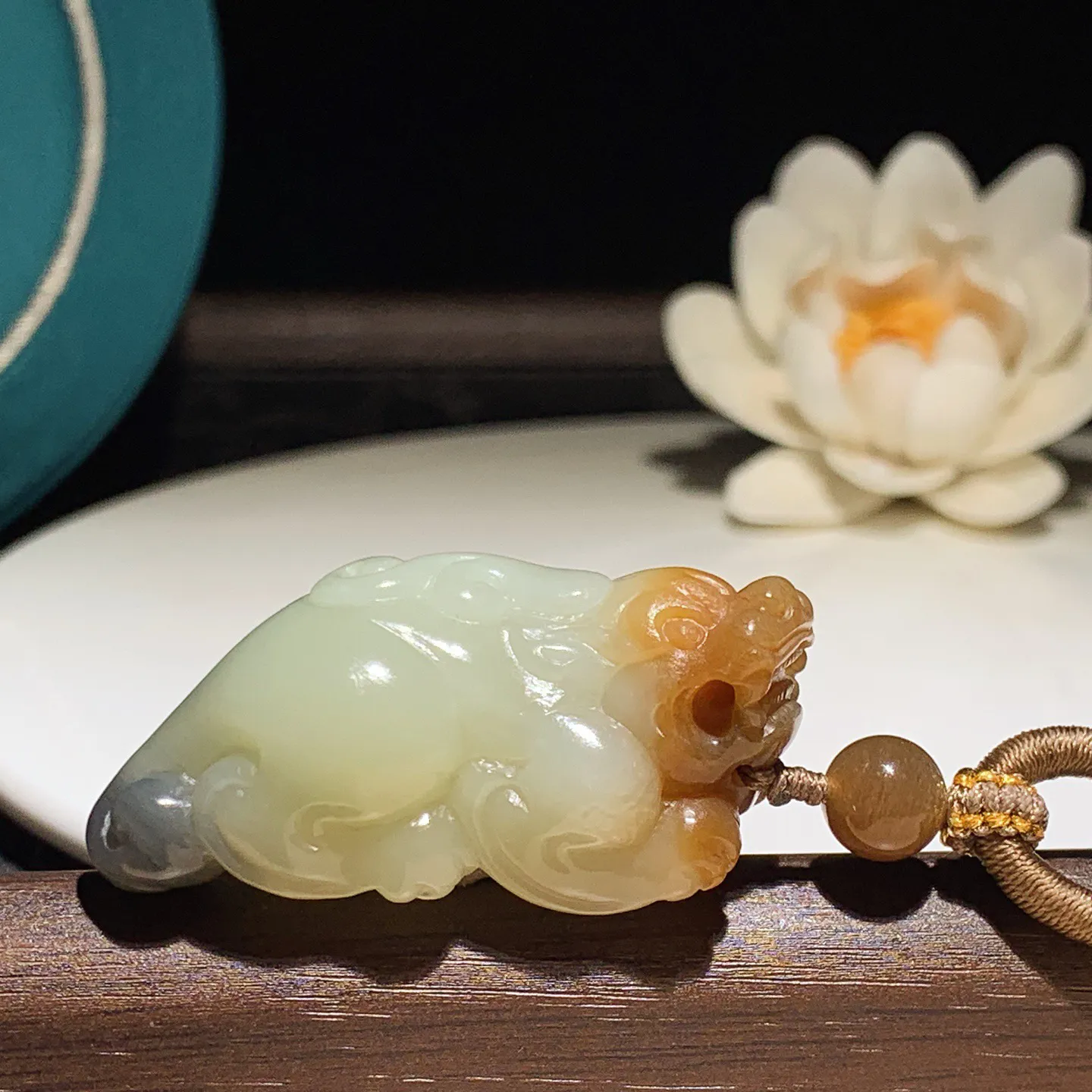 新疆和田玉且末糖招财进宝貔貅挂件。尺寸47/24/19重34克,玉质细腻油润 底色纯净 脂粉好,品质