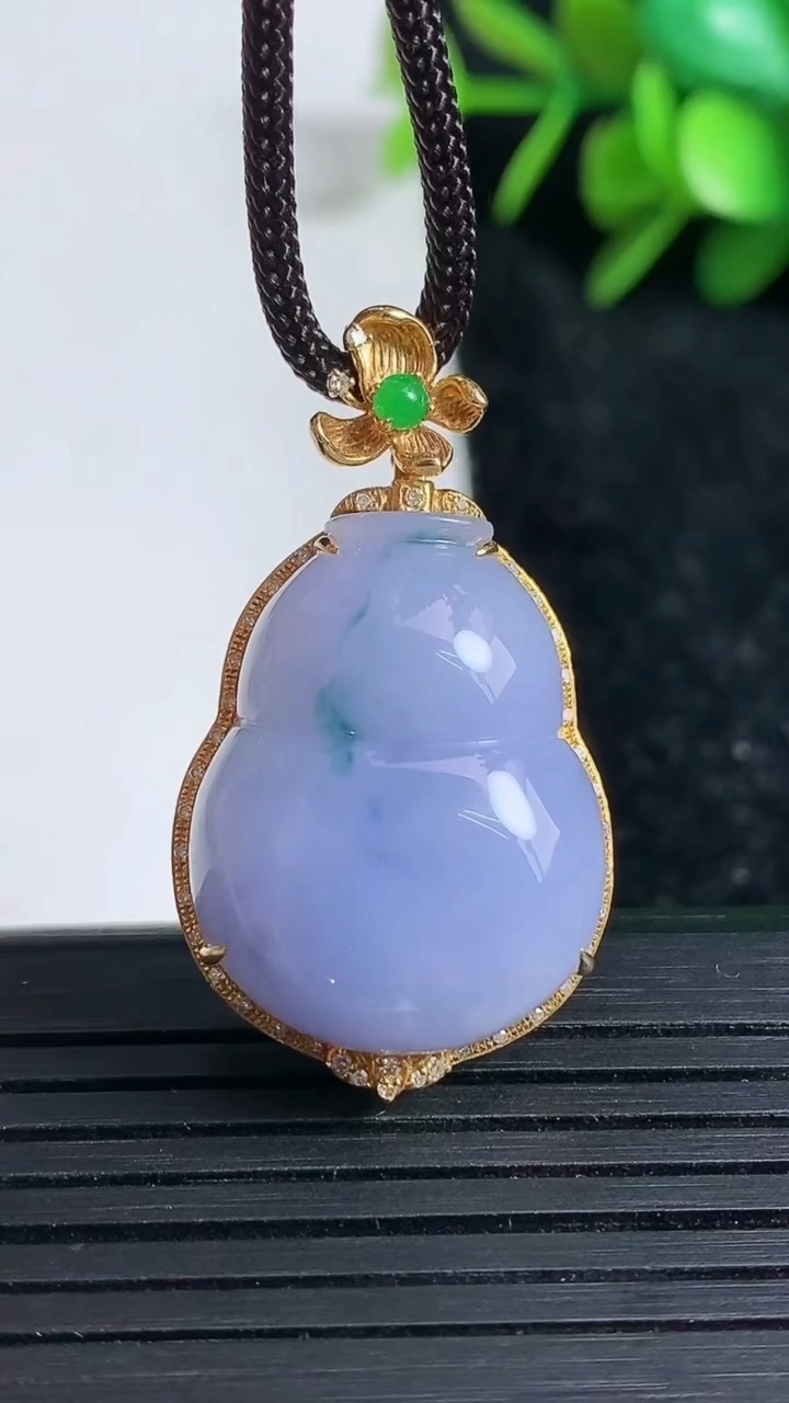 天然A货翡翠18K金紫罗兰飘花葫芦吊坠尺寸35.3-20-10.6裸石23.9-18.2重量:8.8