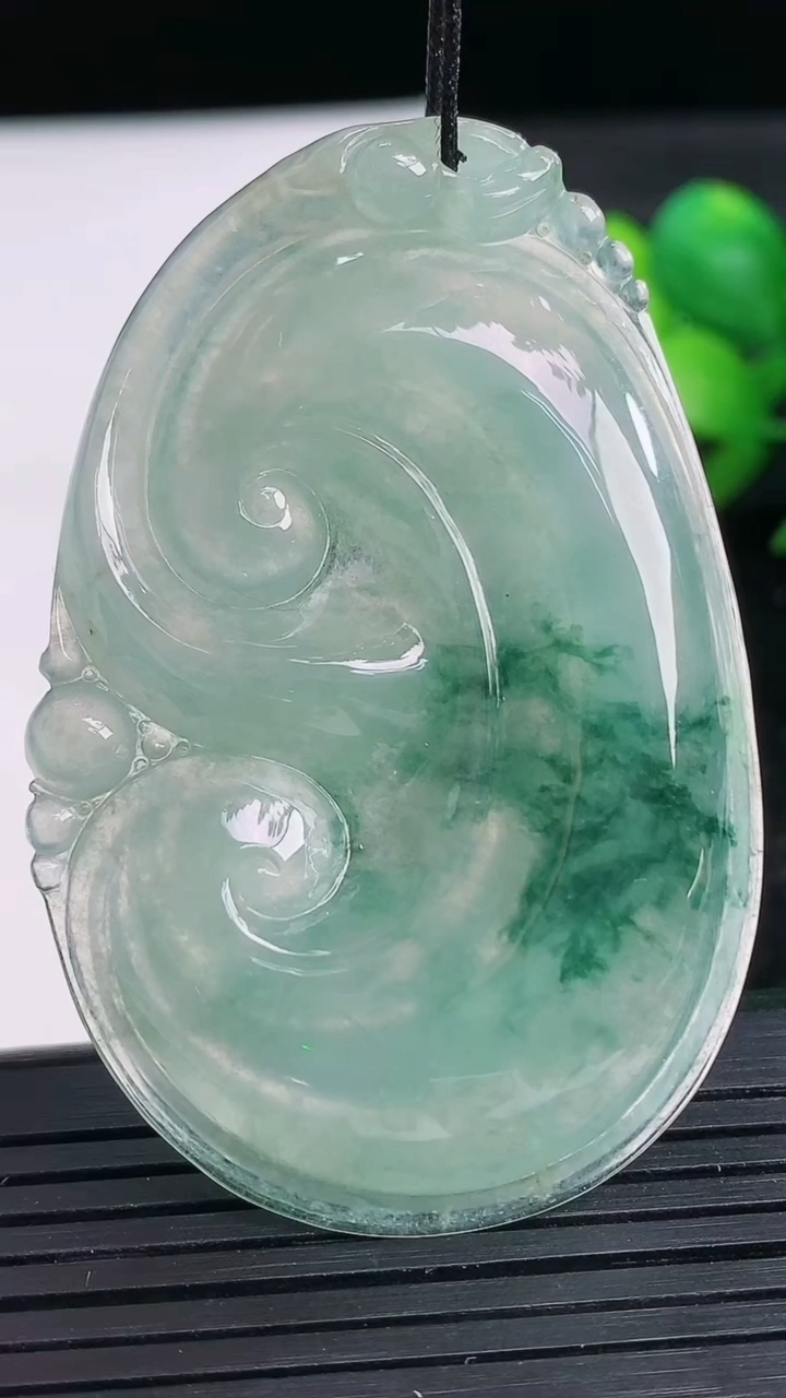 天然A货翡翠冰种飘花如意吊坠尺寸57.3-38.3-6.6重量:22.63g 3月27日