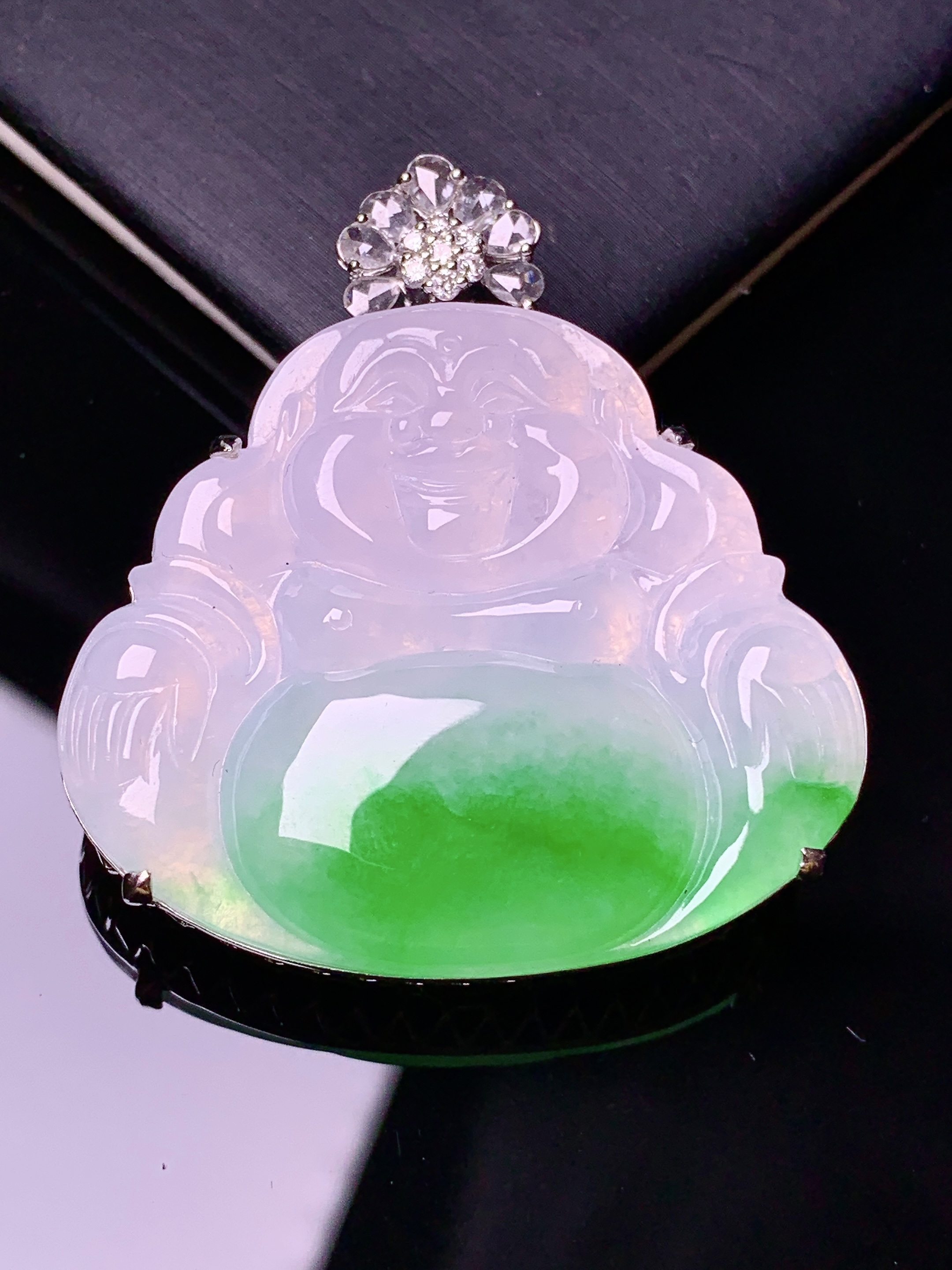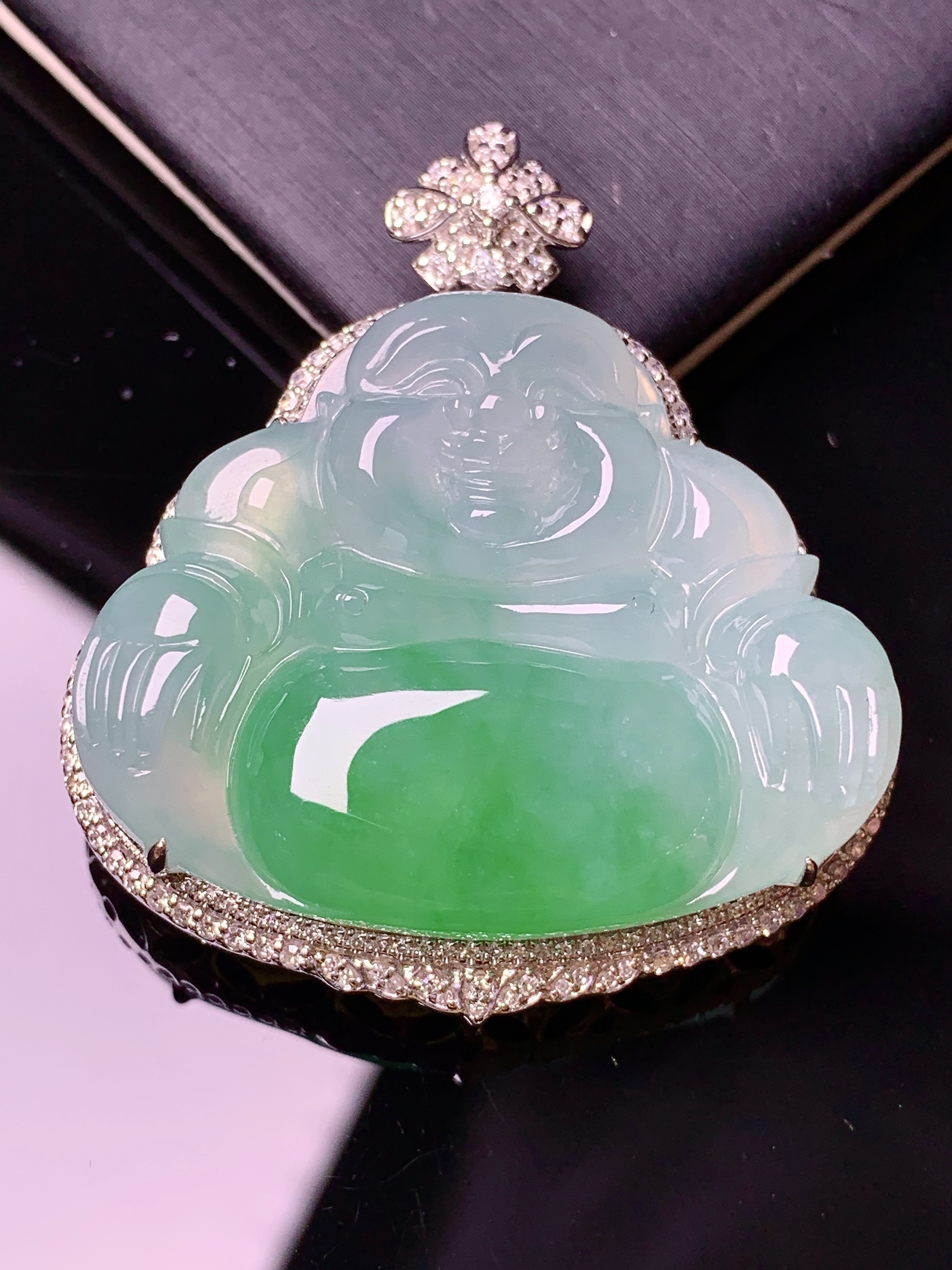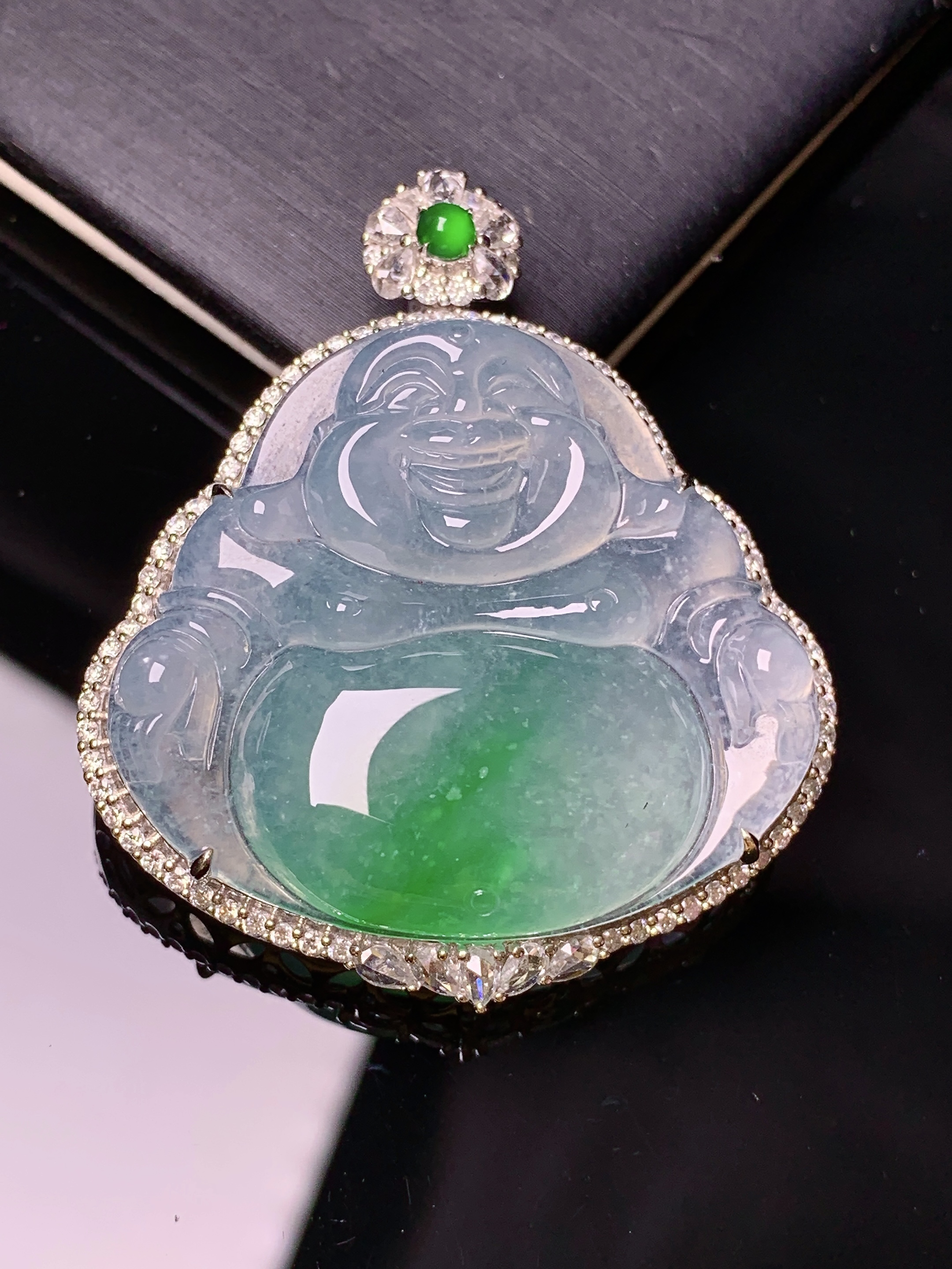 18k金钻镶嵌飘绿佛公吊坠 玉质细腻 色泽艳丽清新 水润亮眼 整体尺寸43.2*38.2*14.2