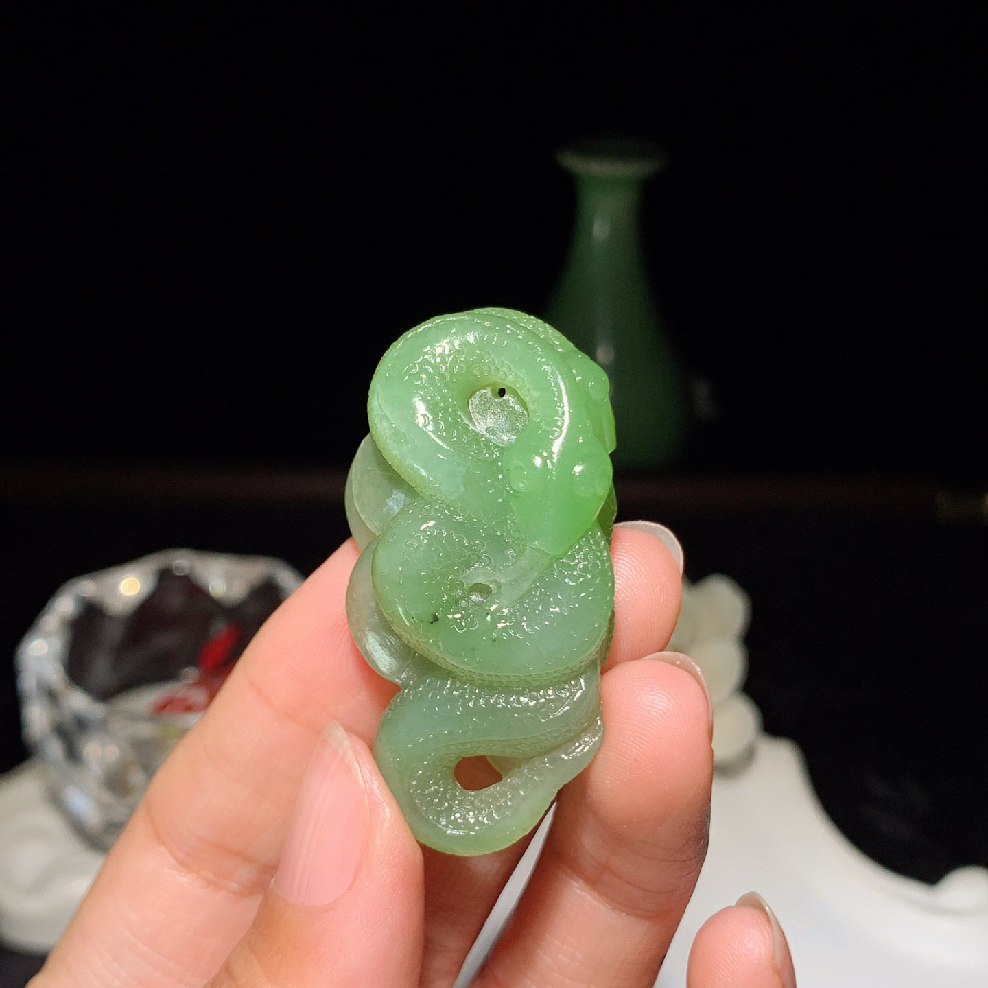 和田玉青海翠翠青富贵缠身蛇挂件。尺寸48/25/13重21.5克 玉质细腻油润。手推出油。品相大气